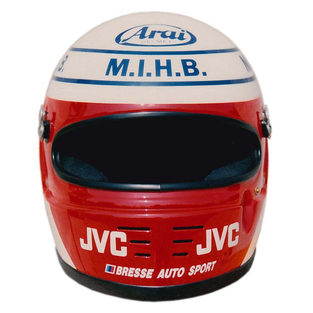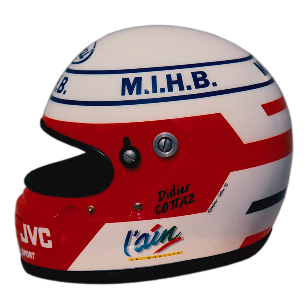 Circuit 1993 Didier COTTAZ Casque Arai GP 2, peint par Christian Roux / Rainbow Colors en 1993 pour Didier Cottaz, Team Formula Project, Champion de France de Formule 3. Précédent Suivant