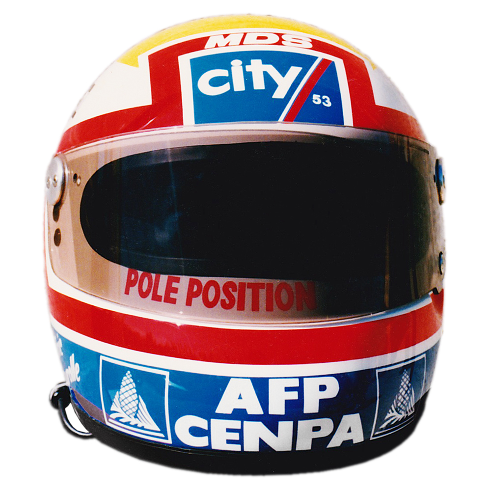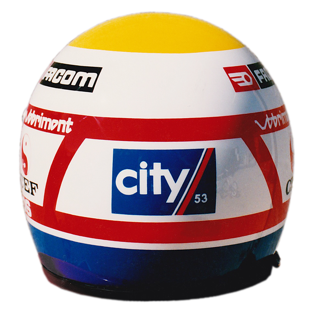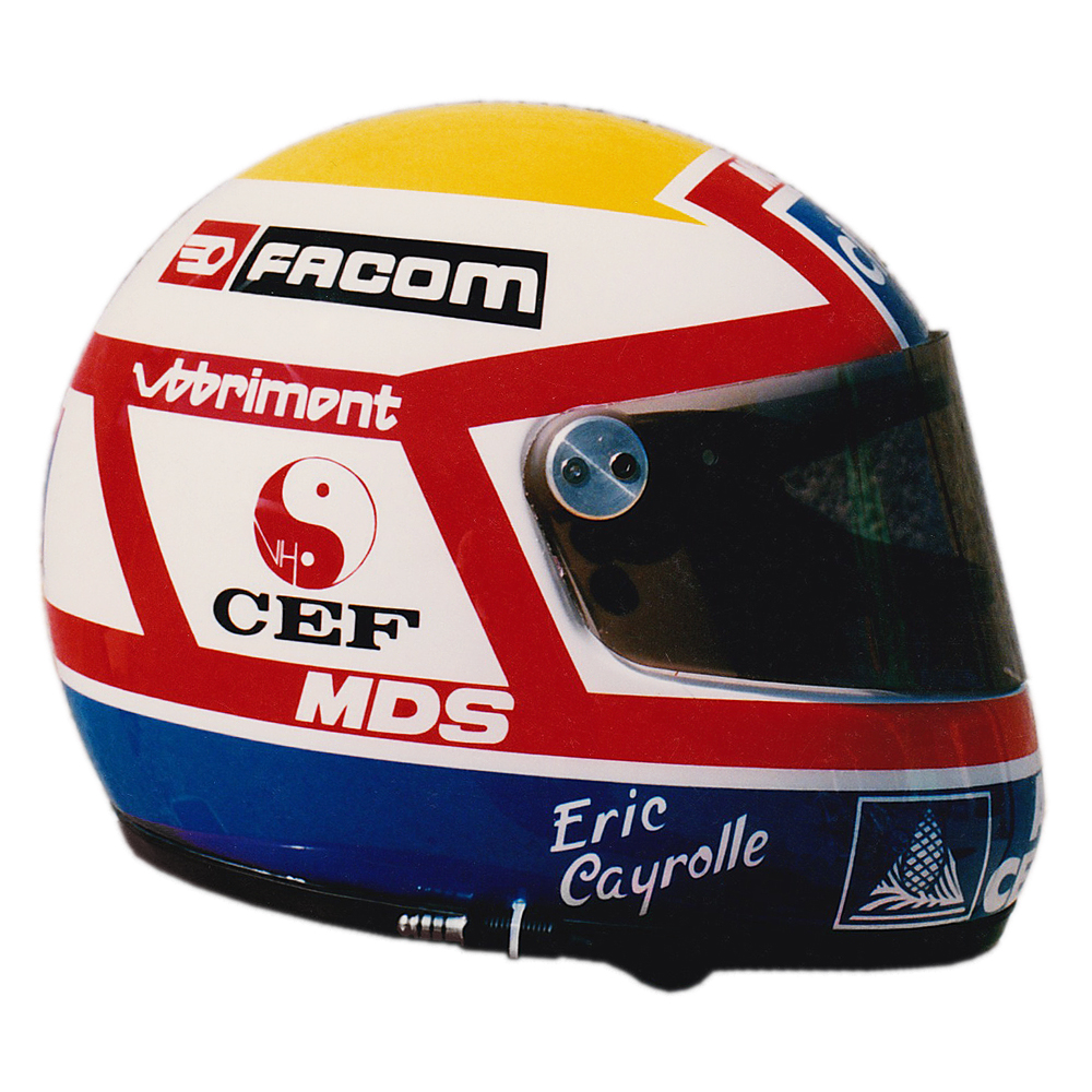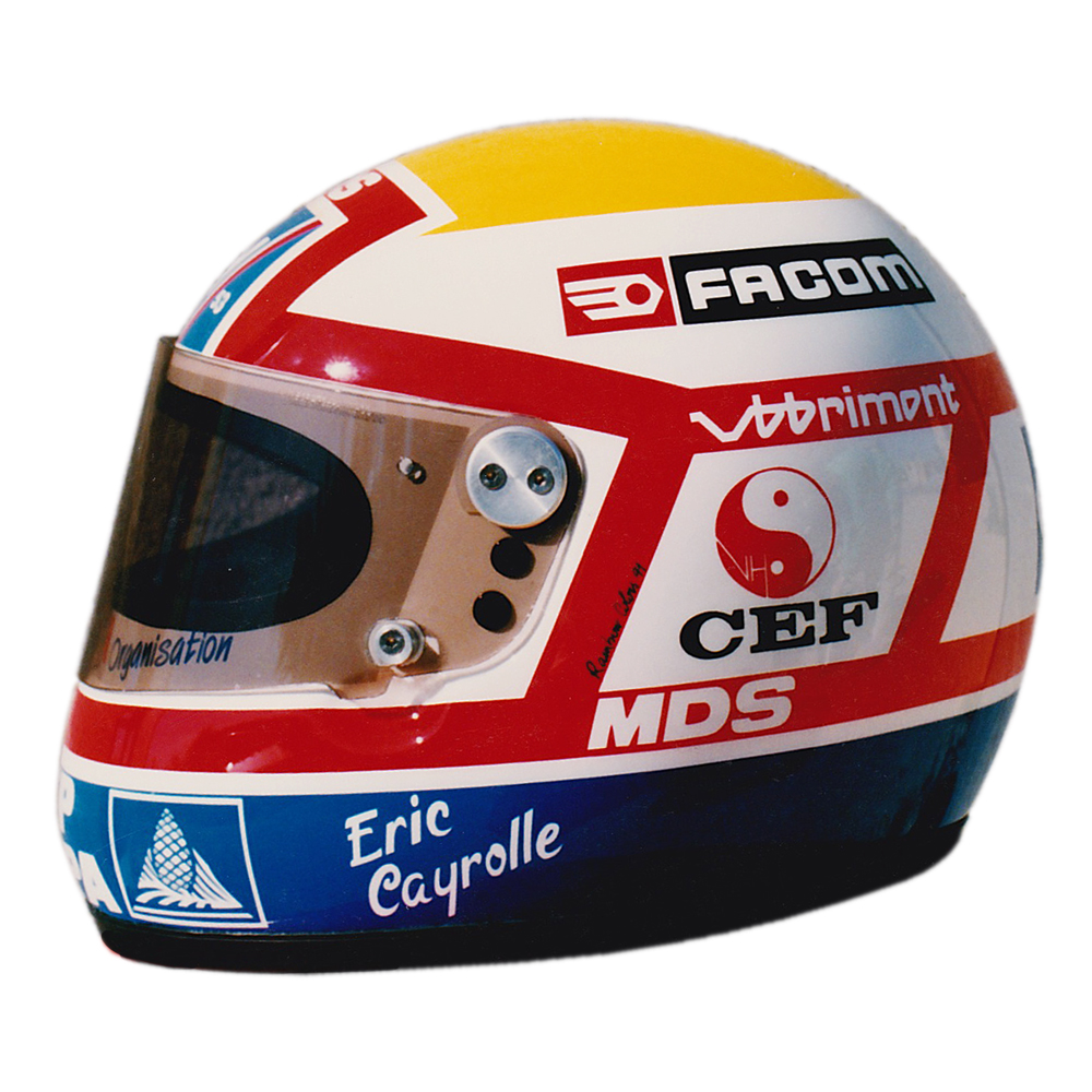 Circuit 1991 Eric CAYROLLE #1 Casque MDS F1, peint par Christian Roux / Rainbow Colors en 1991 pour Eric Cayrolle, Team DG Racing, Championnat de France de Formule 3. Précédent Suivant