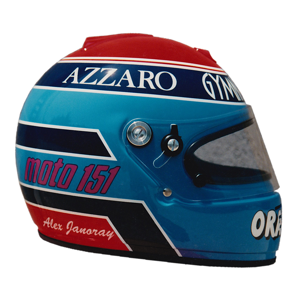 Circuit 1993 Alexandre JANORAY Casque Arai GP 3, peint par Christian Roux / Rainbow Colors en 1993 pour Alexandre Janoray, Équipe Promatecme, 6ème du Championnat de France de Formule 3. Précédent Suivant