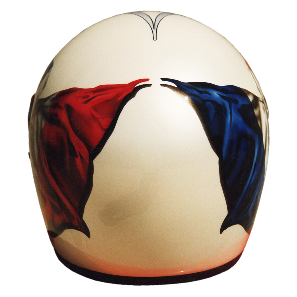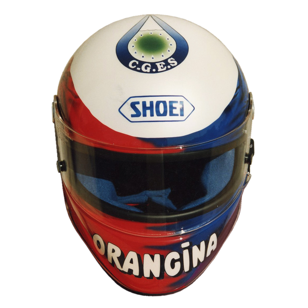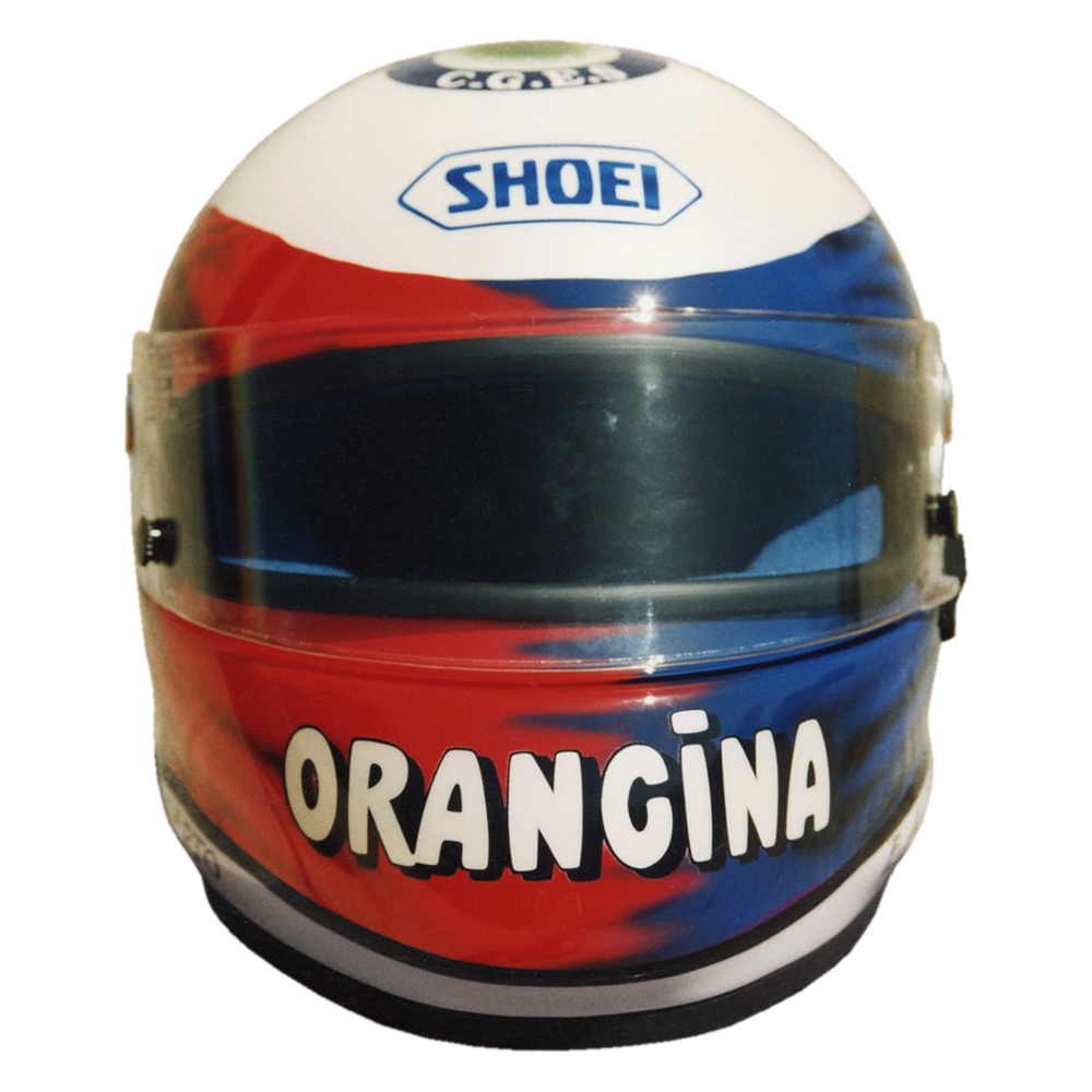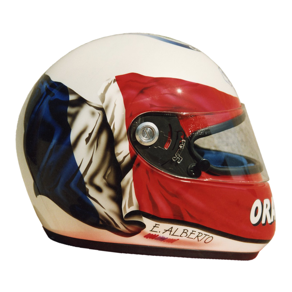 Circuit 1993 Eric ALBERTO #2 Casque Shoei X4, crée et peint par Christian Roux / Rainbow Colors en 1993 pour Eric Alberto, Team LD Autosport, Championnat de France de Formule 3. Précédent Suivant