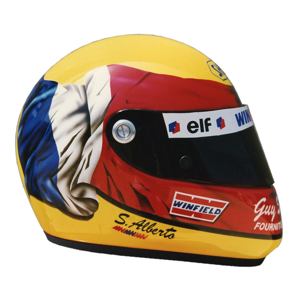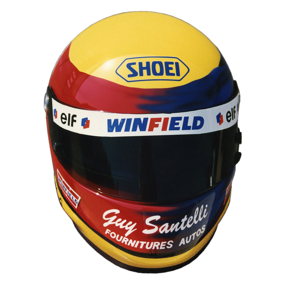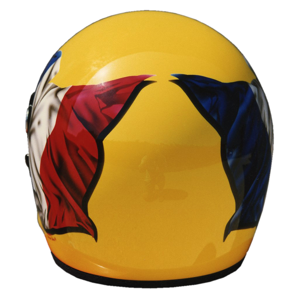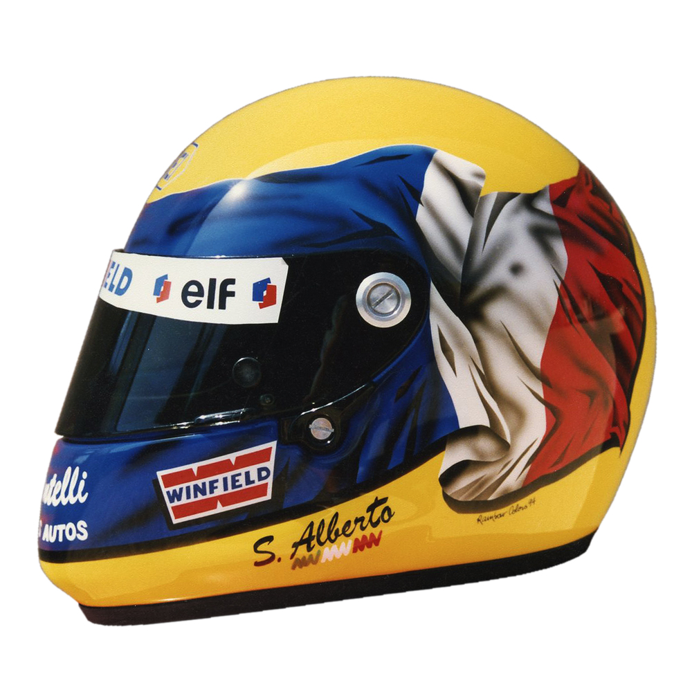 Circuit 1994 Sébastien ALBERTO Casque Shoei X4, crée et peint par Christian Roux / Rainbow Colors en 1994 pour Sébastien Alberto, Team Elf La Filière, Championnat de France de Formule Renault. Précédent Suivant