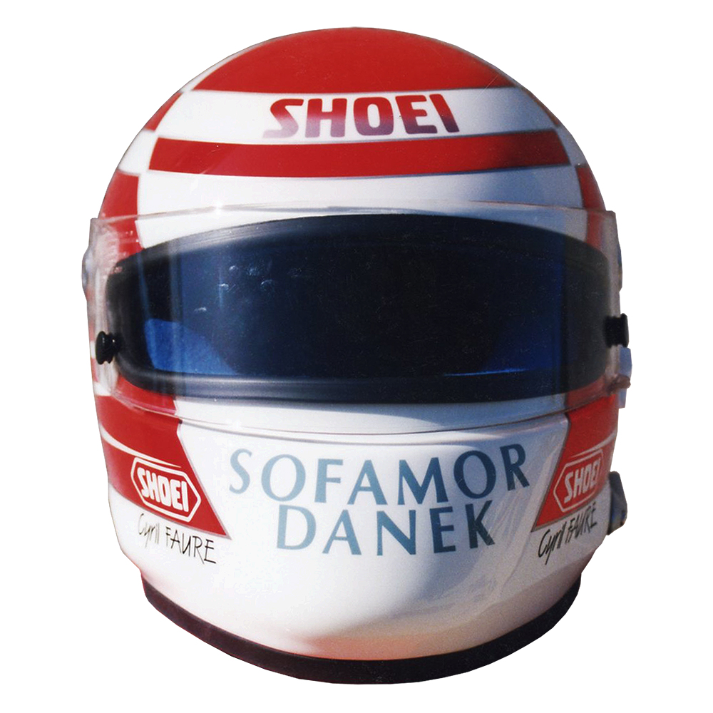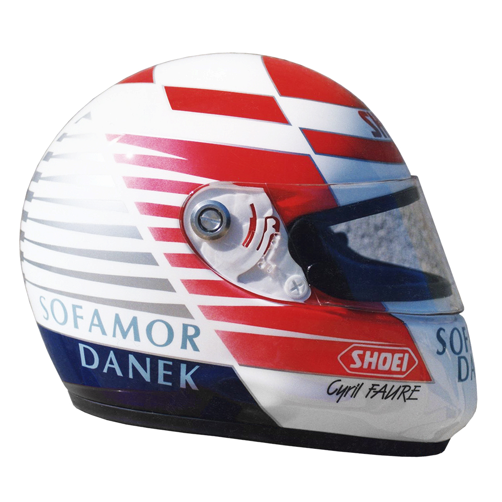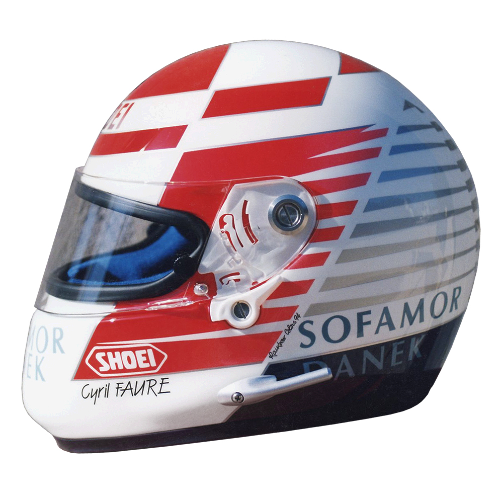 Circuit 1994 Cyril FAURE Casque Shoei X 4, crée et peint par Christian Roux / Rainbow Colors en 1994 pour Cyril Faure, Team Bernard Tironneau, Championnat de France de Formule Renault. Précédent Suivant