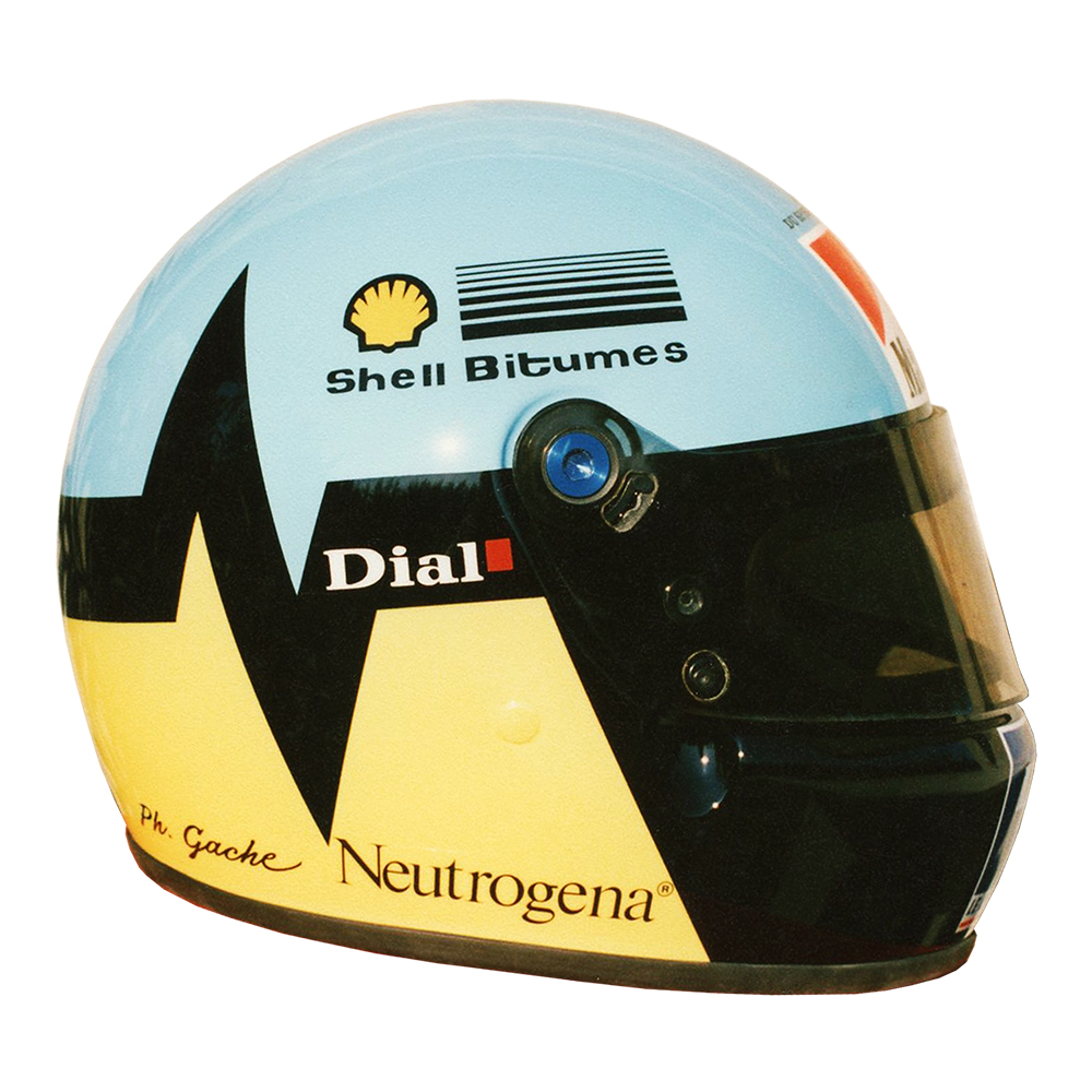 Circuit 1990 Philippe GACHE #2 Casque Bell XFM-1, peint par Christian Roux / Rainbow Colors en 1990 pour Philippe Gache, Team Apomatox et Galaxy Racing, Championnat International de Formule 3000. Précédent Suivant