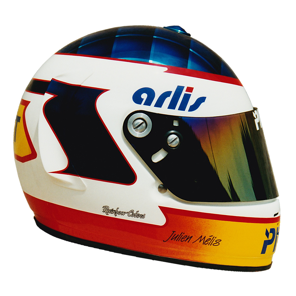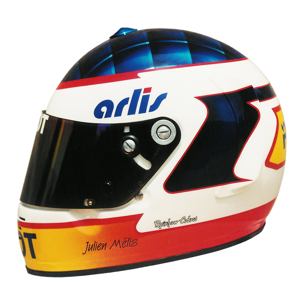 Circuit 2000 Julien MÉLIS #2 Casque Arai GP 4, peint par Christian Roux / Rainbow Colors en 2000 pour Julien Mélis, Team Graff Racing, Vice Champion de France de Formule Ford. Précédent Suivant