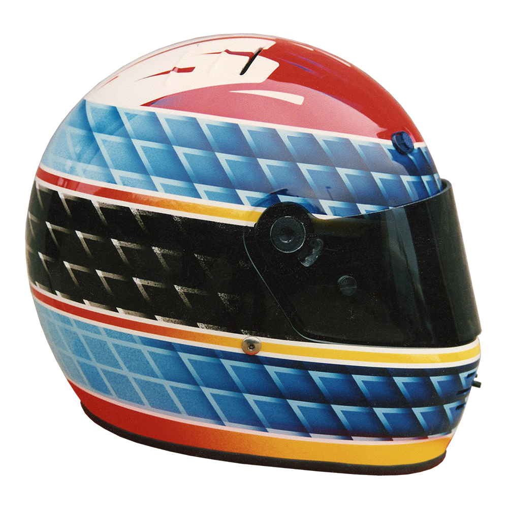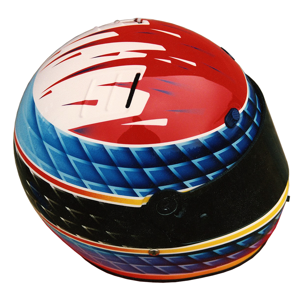 Circuit 1995 Patrick BONJOUR #1 Casque Bell M3, peint par Christian Roux / Rainbow Colors en 1995 pour Patrick Bonjour pour les 24 Heures de Spa Francorchamps. Précédent Suivant