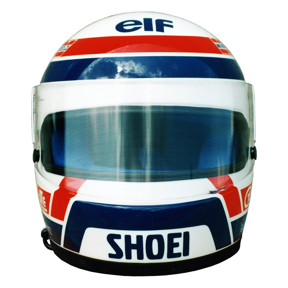 Circuit 1990 Guillaume GOMEZ Casque Shoei GRV 4, peint par Christian Roux / Rainbow Colors en 1990 pour Guillaume Gomez, écurie Elf Gitanes, 3ème du Championnat de France de Formule Renault. Précédent Suivant