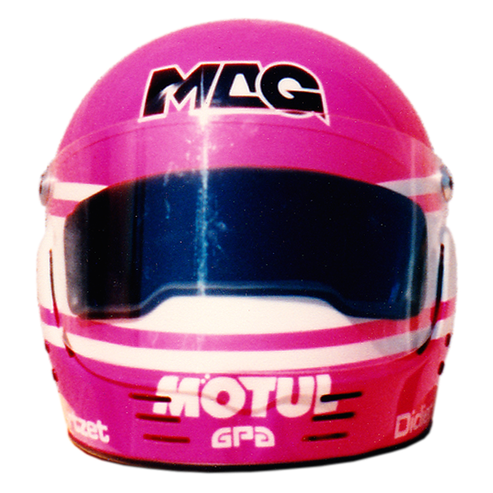 Circuit 1987 Didier ARTZET #3 Casque GPA G1, peint par Christian Roux / Rainbow Colors en 1987 pour Didier Artzet, Écurie KTR, Vainqueur Grand Prix de Monaco F3. Précédent Suivant