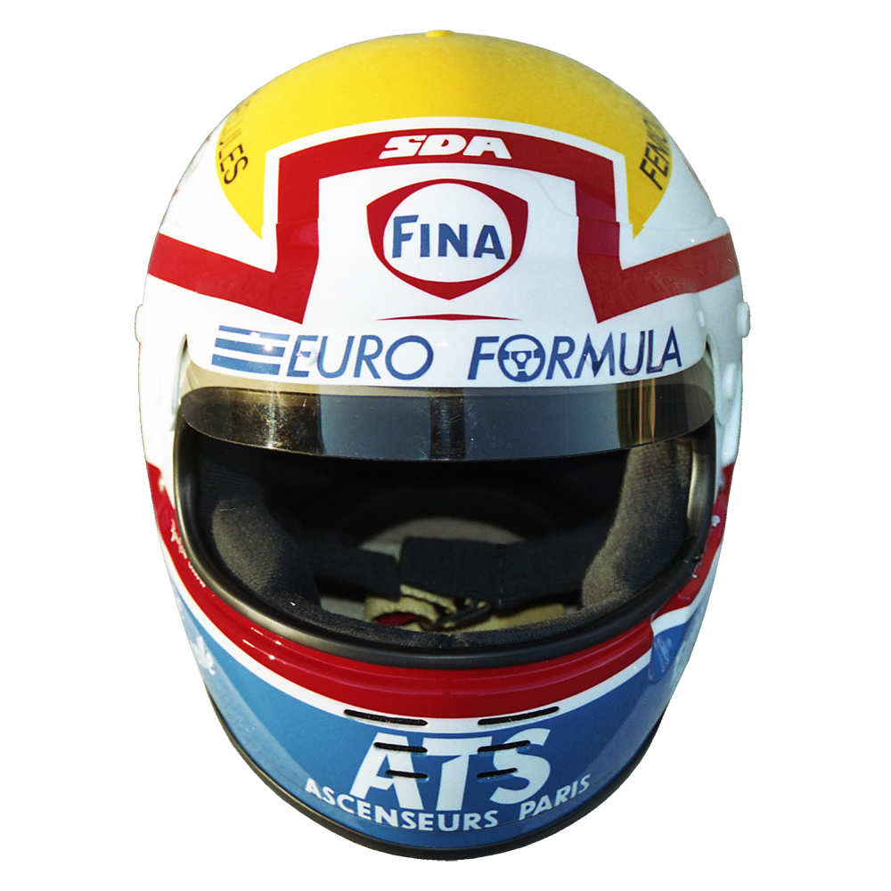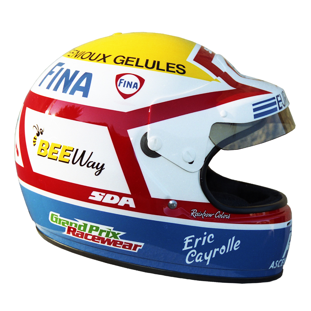 Circuit 1999 Eric CAYROLLE Casque Arai GP 3 T équipé d'une visière Sparco, peint par Christian Roux / Rainbow Colors en 1999 pour Eric Cayrolle, Team SDA Sport, Vice Champion de France de Supertourisme. Précédent Suivant