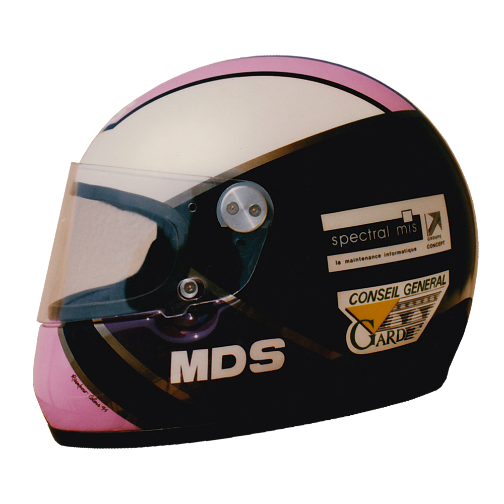 Circuit 1991 Laurent DAUMET #1 Casque MDS F1, peint par Christian Roux / Rainbow Colors en 1991 pour Laurent Daumet, Team LD Autosport, Championnat de France de Formule 3. Précédent Suivant