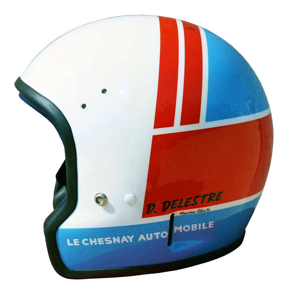 Circuit 1990 Dominique DELESTRE Casque Bell Mag 4, peint par Christian Roux / Rainbow Colors en 1990 pour Dominique Delestre, Coupe 309 Peugeot, Écurie Apomatox. Précédent Suivant