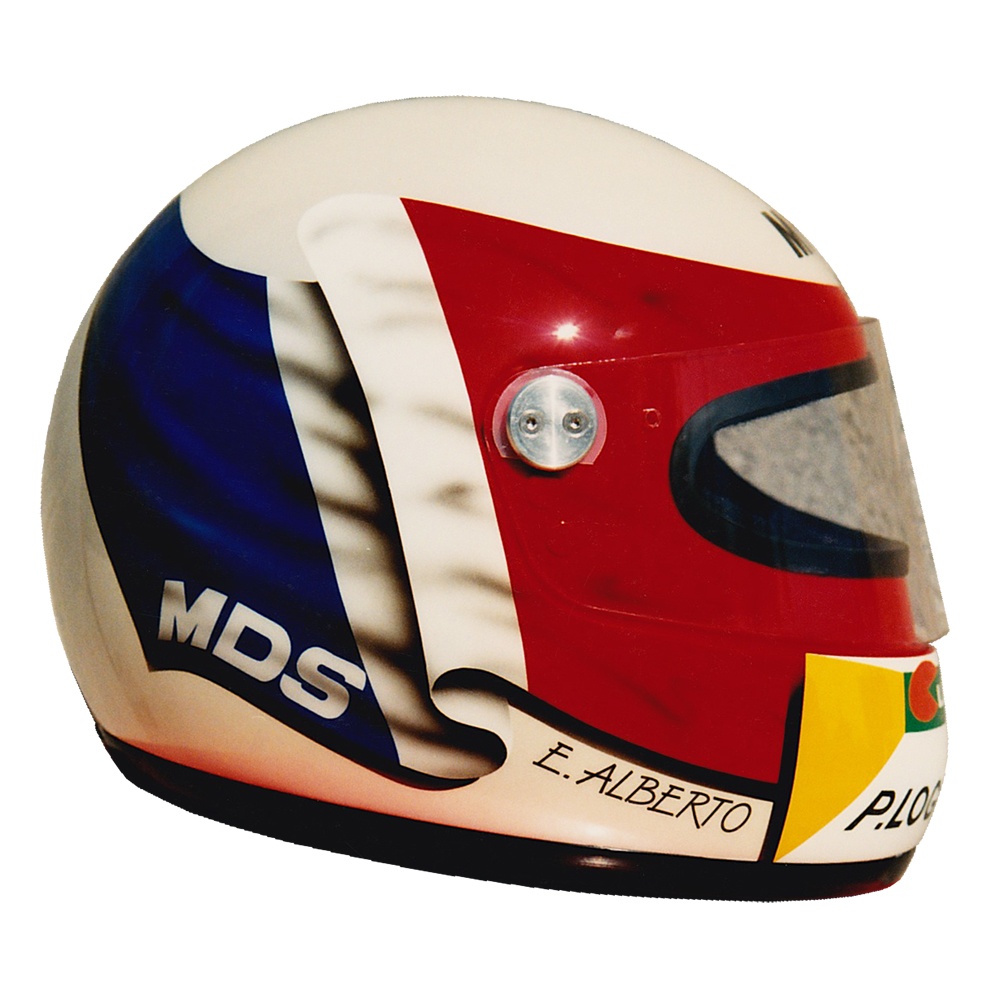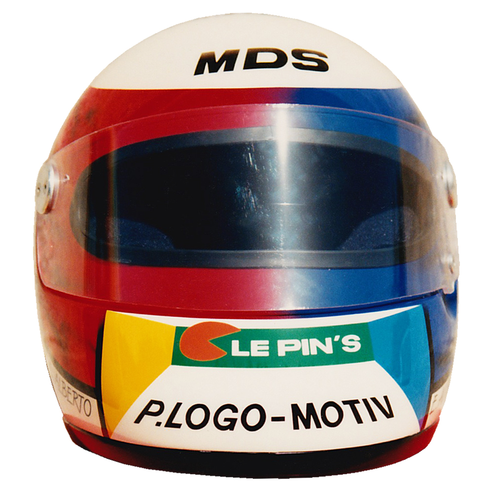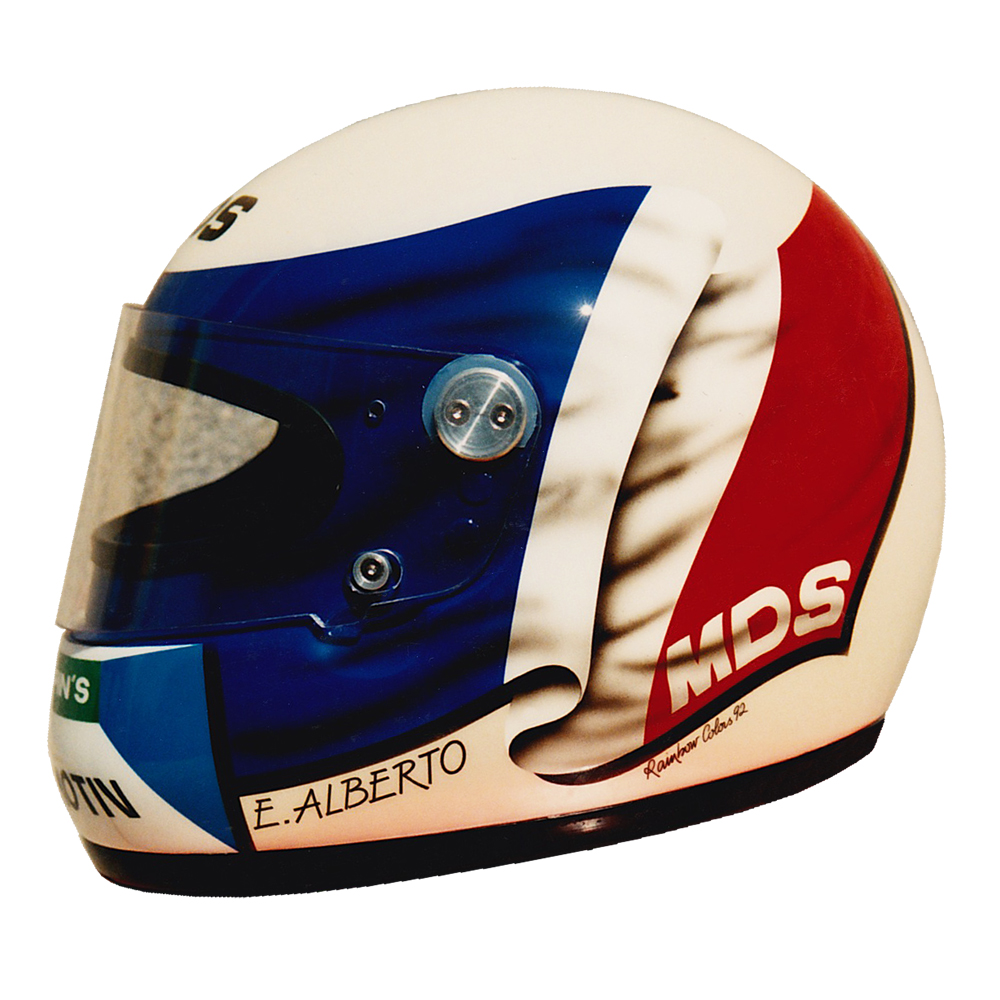 Circuit 1992 Eric ALBERTO #2 Casque MDS F1, crée et peint par Christian Roux / Rainbow Colors en 1992 pour Eric Alberto, Team LD Autosport, Championnat de France de Formule 3. Précédent Suivant