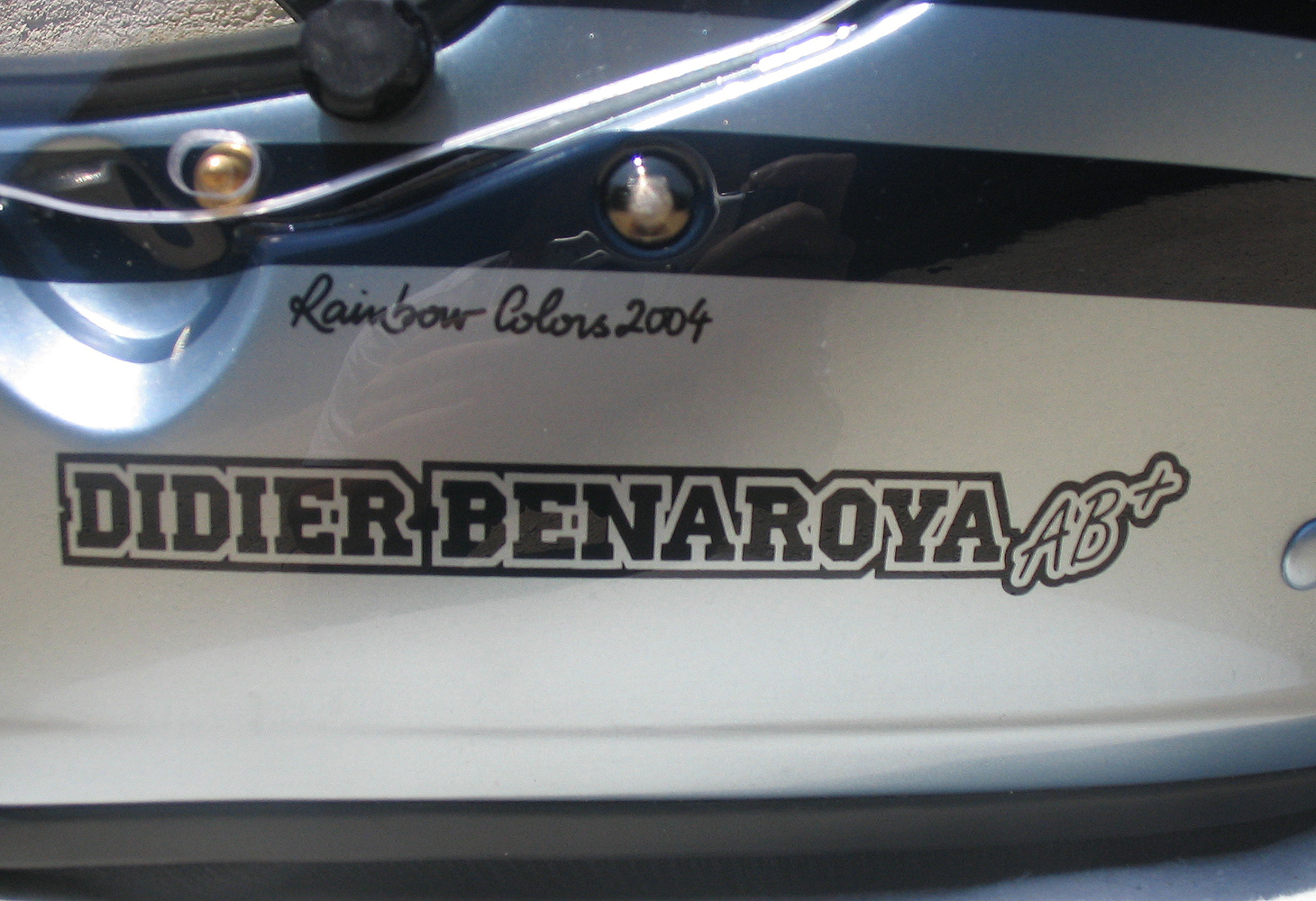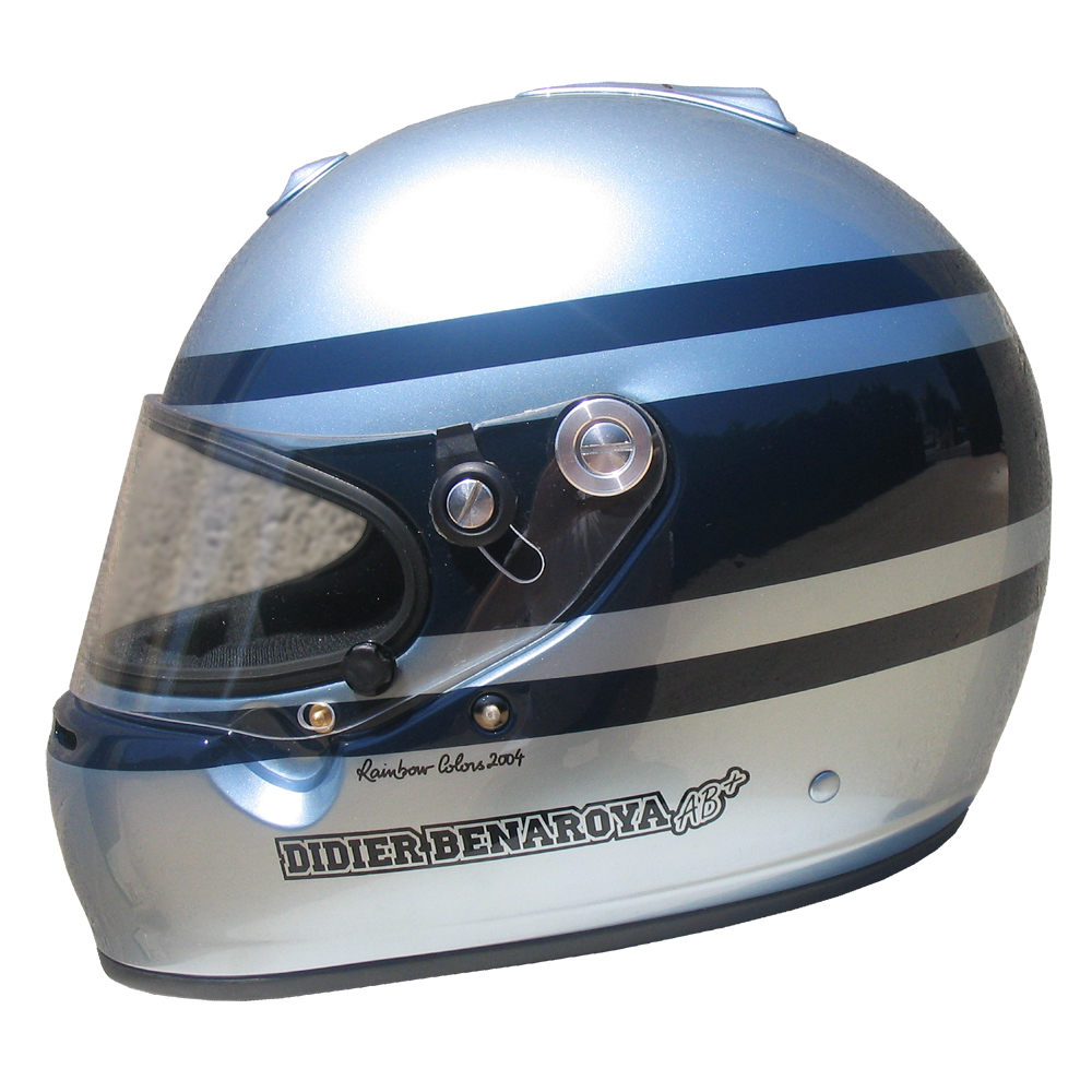 Circuit 2004 Didier BENAROYA Casque Arai GP 5 S, peint par Christian Roux / Rainbow Colors en 2004 pour Didier Benaroya, Team Springfield, Courses de Véhicules Historiques. Précédent Suivant