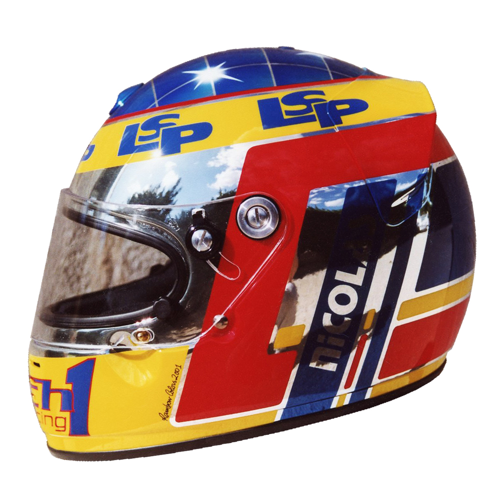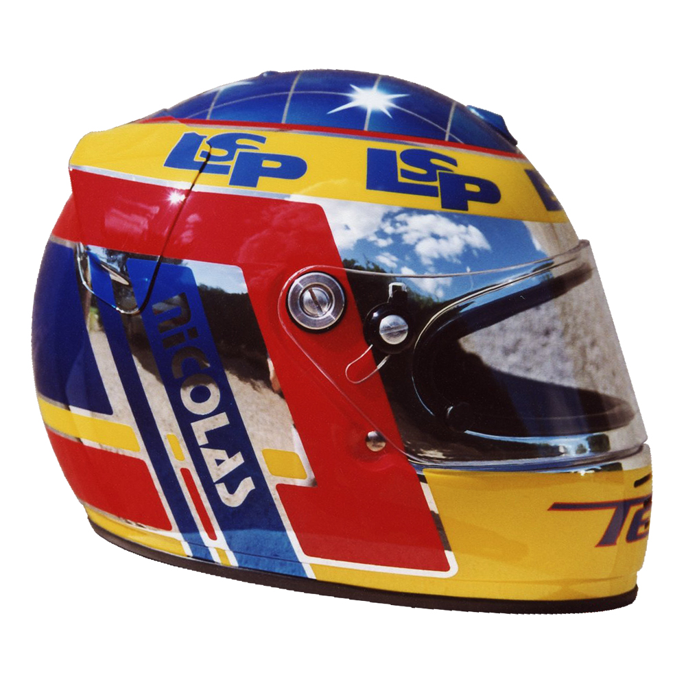 Circuit 2001 Nicolas LAPIERRE #1 Casque Arai GP 5, peint par Christian Roux / Rainbow Colors en 2001 pour Nicolas Lapierre, LSP Racing Team Formule Renault 2.0 France et Tech 1 Racing Eurocup. Précédent Suivant