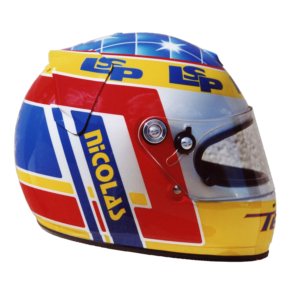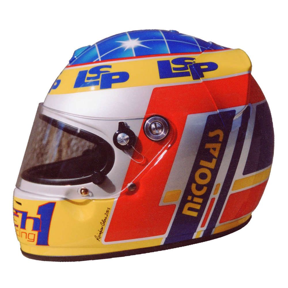 Circuit 2001 Nicolas LAPIERRE #2 Casque Arai GP 5, peint par Christian Roux / Rainbow Colors en 2001 pour Nicolas Lapierre, LSP Racing Team Formule Renault 2.0 France et Tech 1 Racing Eurocup. Précédent Suivant