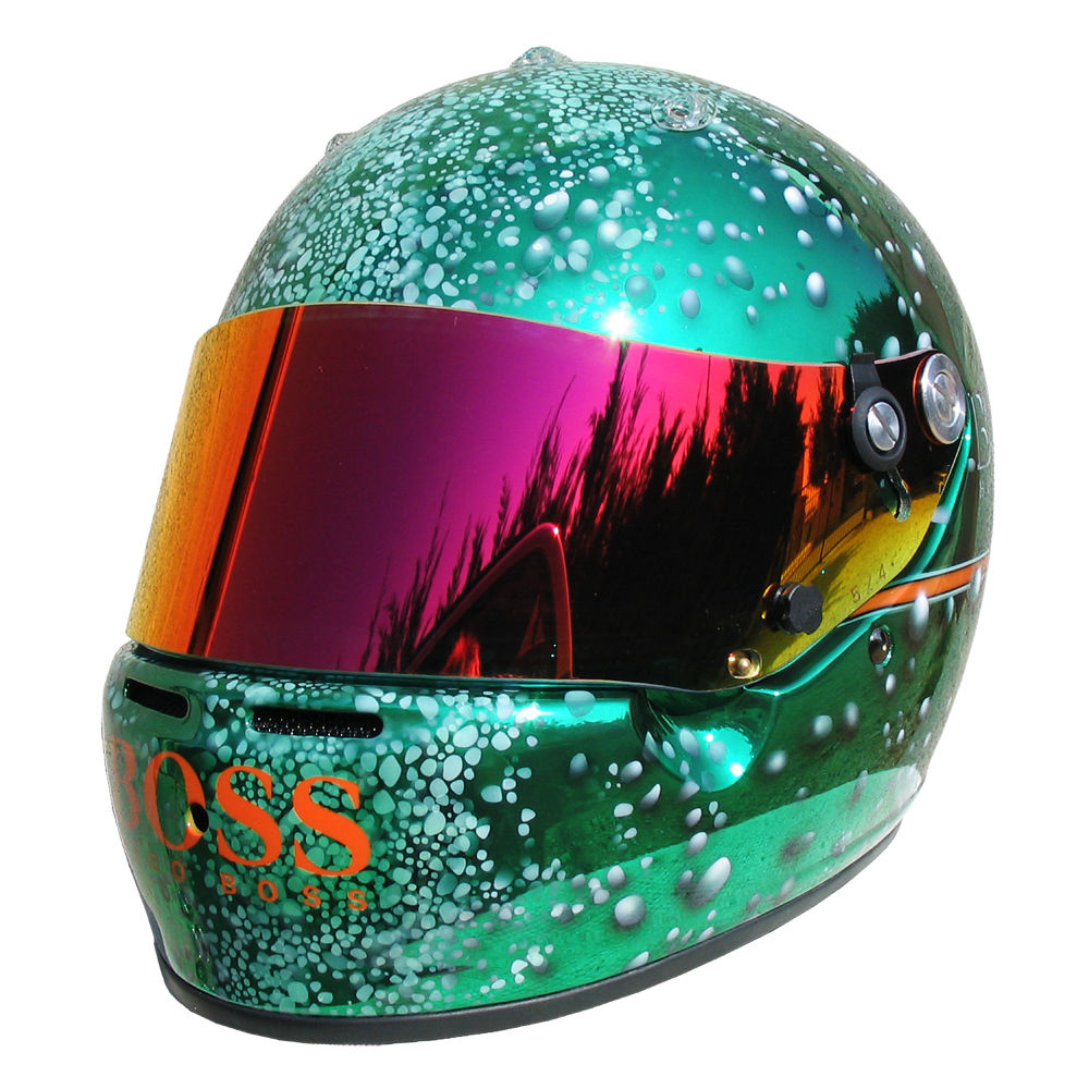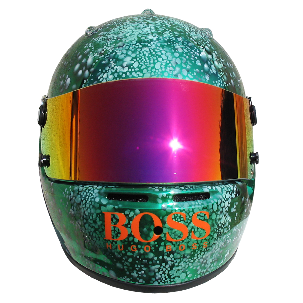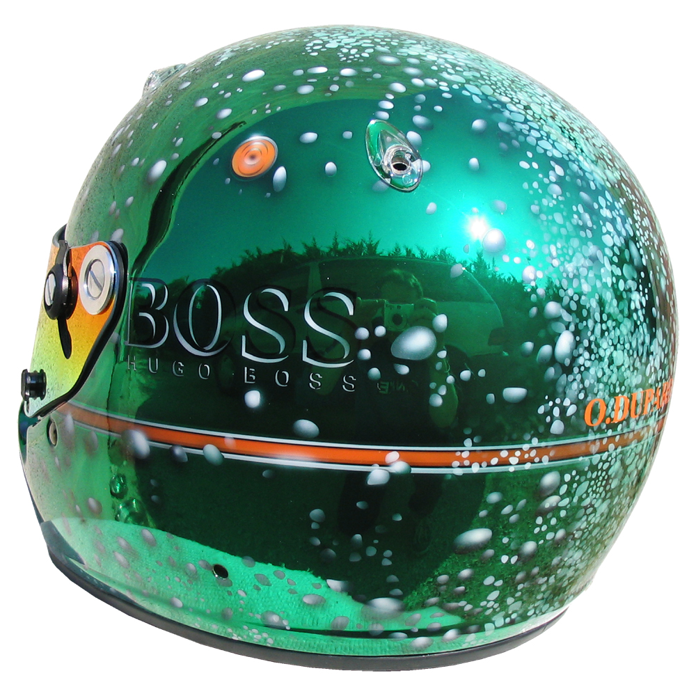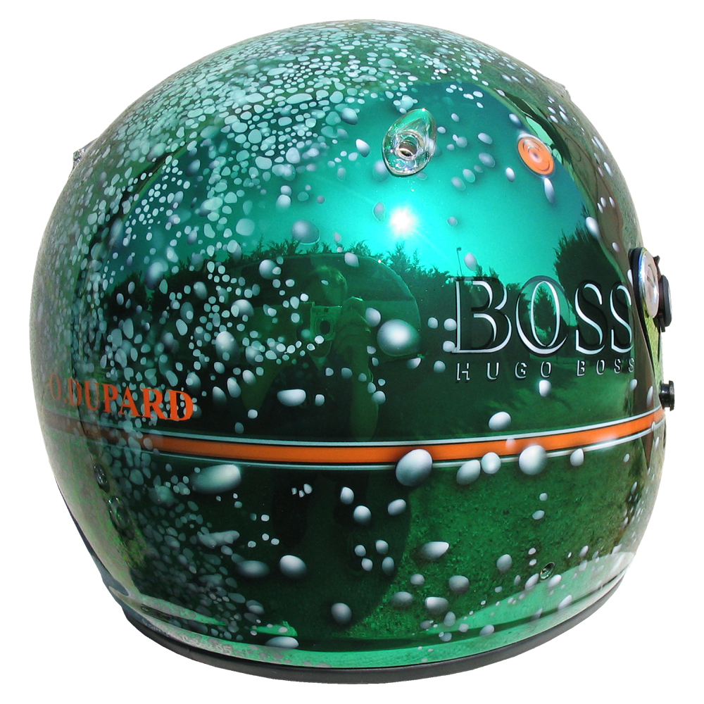 Circuit 2005 Olivier DUPARD Casque Arai GP 5, crée et peint en 2005 d'aprés une publicité Boss, pour Olivier Dupard, Team Larbre Compétition, Championnat de France GT et 24 Heures du Mans. Précédent Suivant