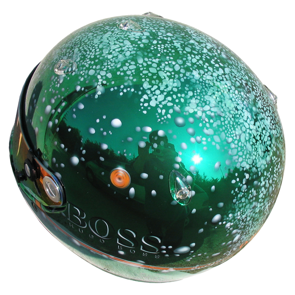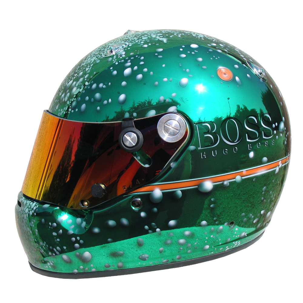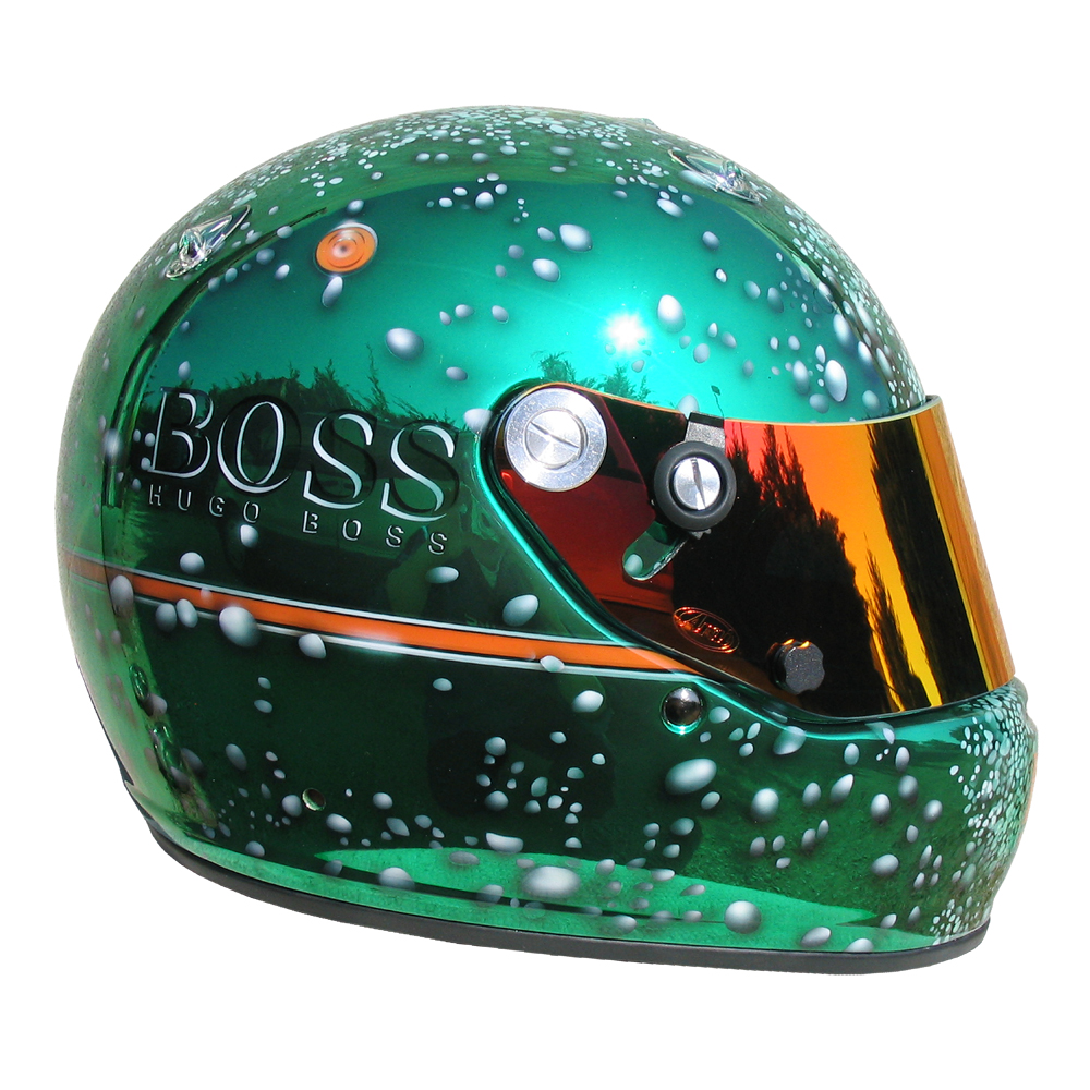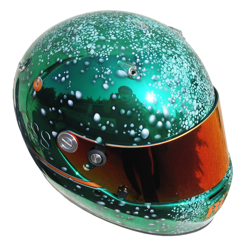 Circuit 2005 Olivier DUPARD Casque Arai GP 5, crée et peint en 2005 d'aprés une publicité Boss, pour Olivier Dupard, Team Larbre Compétition, Championnat de France GT et 24 Heures du Mans. Précédent Suivant