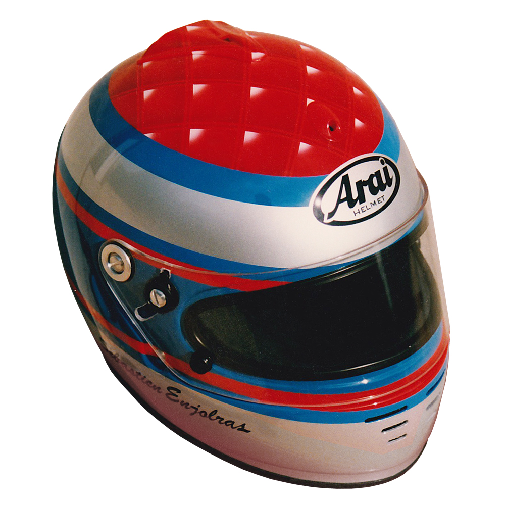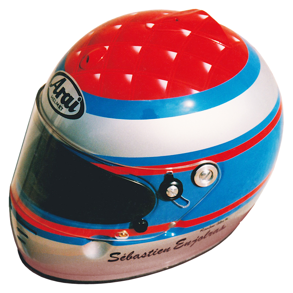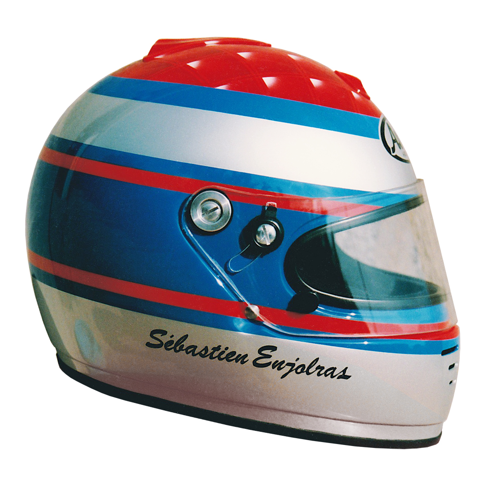 Circuit 1996 Sébastien ENJOLRAS Casque Arai GP 3, peint par Christian Roux / Rainbow Colors en 1996 pour Sébastien Enjolras, Team Elf La Filière, Champion de France de Formule Renault. Précédent Suivant