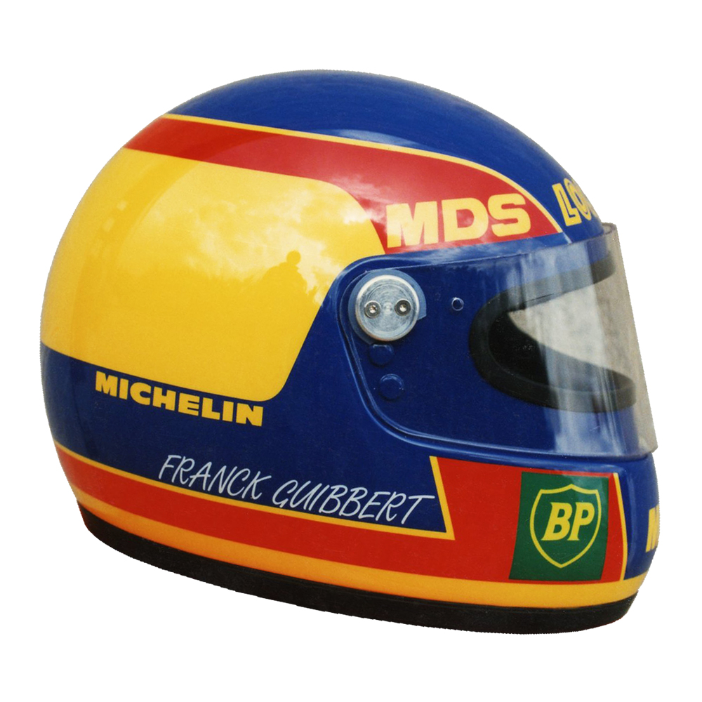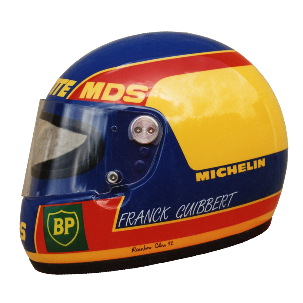 Circuit 1992 Franck GUIBBERT #1 Casque MDS F1, crée et peint par Christian Roux / Rainbow Colors en 1992 pour Franck Guibbert, Team Graff Racing, Championnat de France des Formule 3. Précédent Suivant