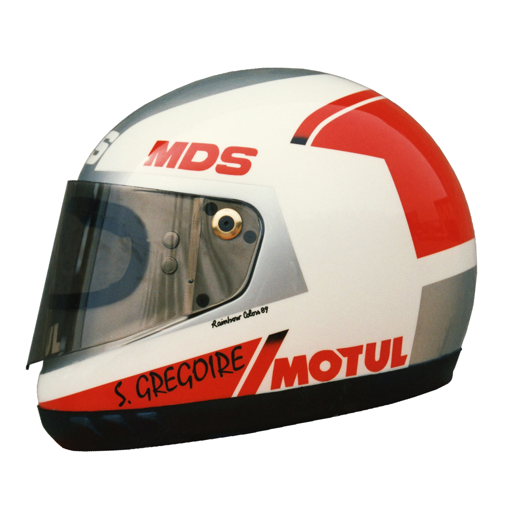 Circuit 1989 Stéphane GREGOIRE Casque MDS F1, crée et peint par Christian Roux / Rainbow Colors en 1989 pour Stéphane Gregoire, Team Motul Nogaro, 5ème du Championnat de France de Formule Renault. Précédent Suivant