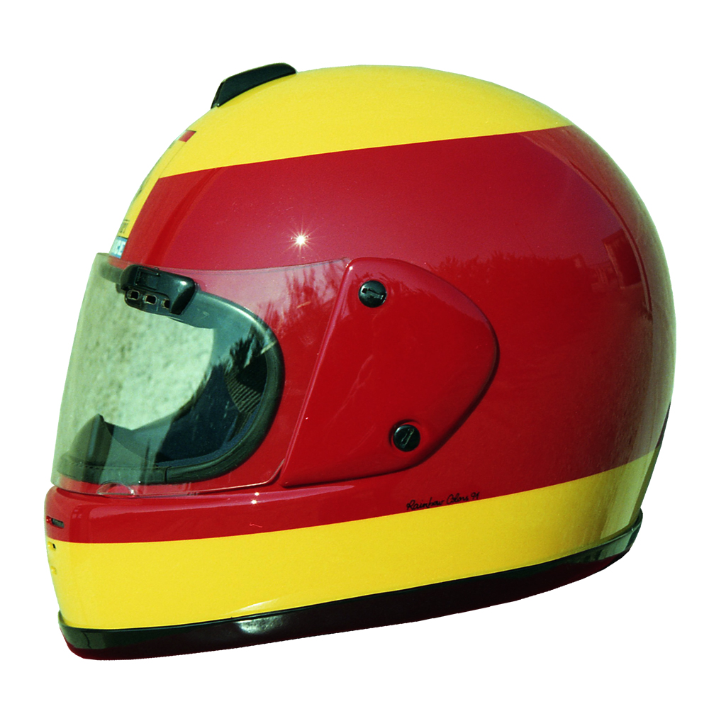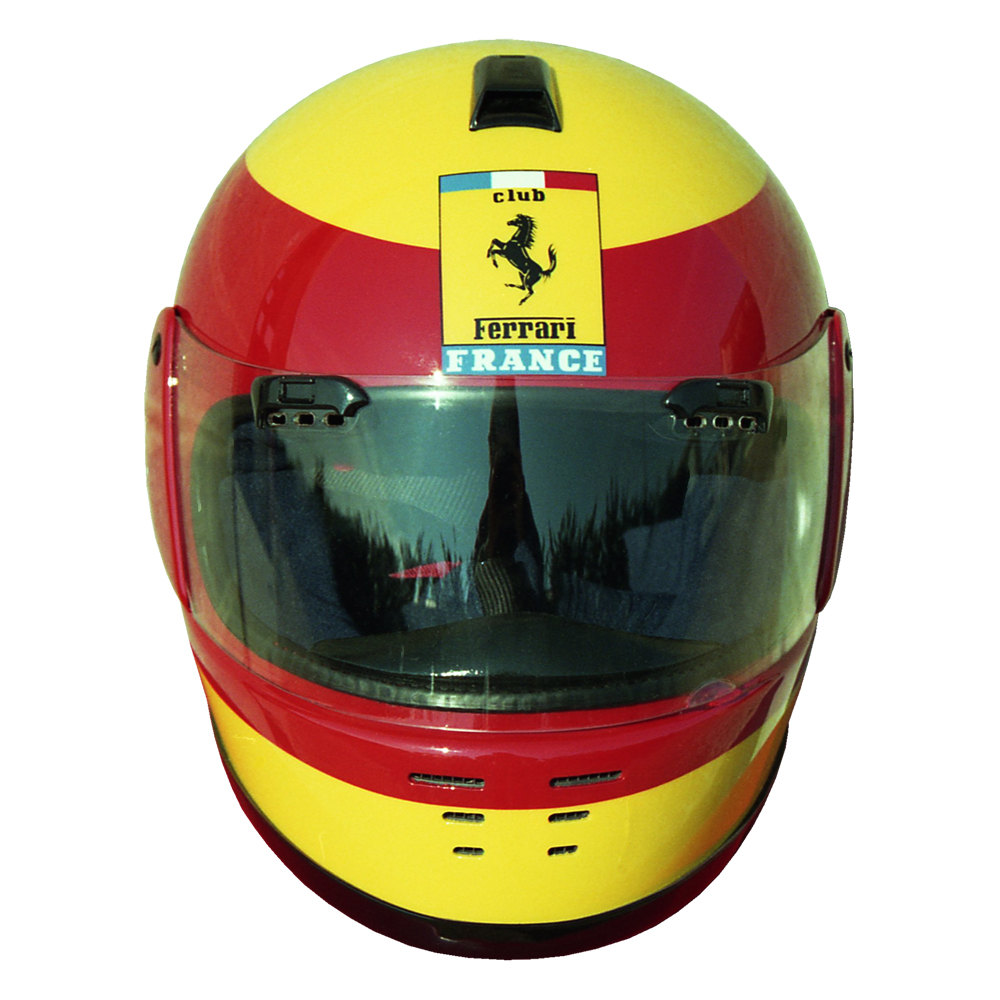 Circuit 1991 Lucien GUINTOLI Casque Arai Rapide, peint par Christian Roux / Rainbow Colors en 1991 pour Lucien Guintoli, Club Ferrari France. Précédent Suivant