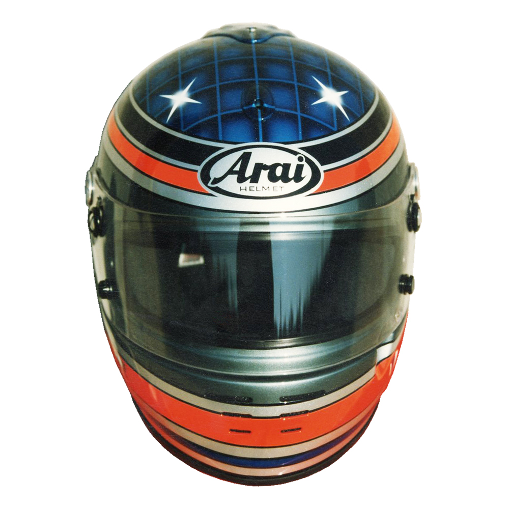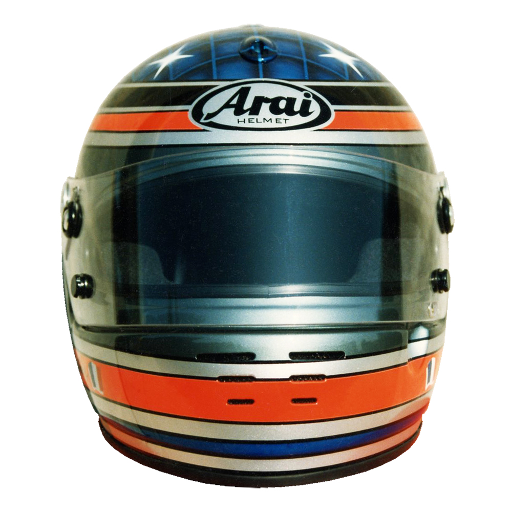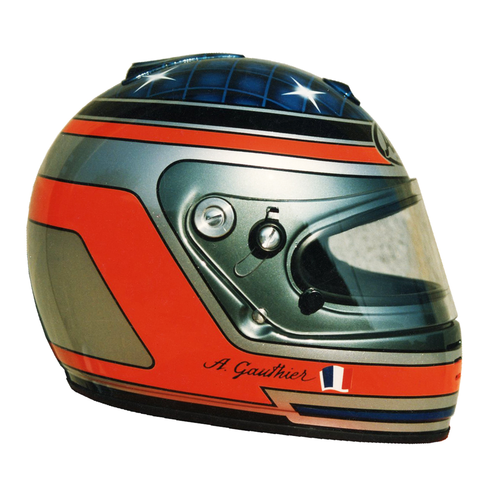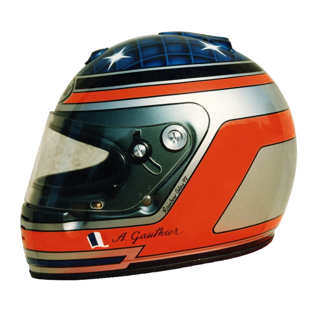 Circuit 1997 Alban GAUTHIER #1 Casque Arai GP 3, peint par Christian Roux / Rainbow Colors en 1997 pour Alban Gauthier, Team La Filiére, Championnat de France de Formule Renault. Précédent Suivant