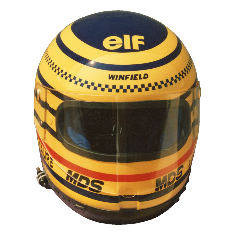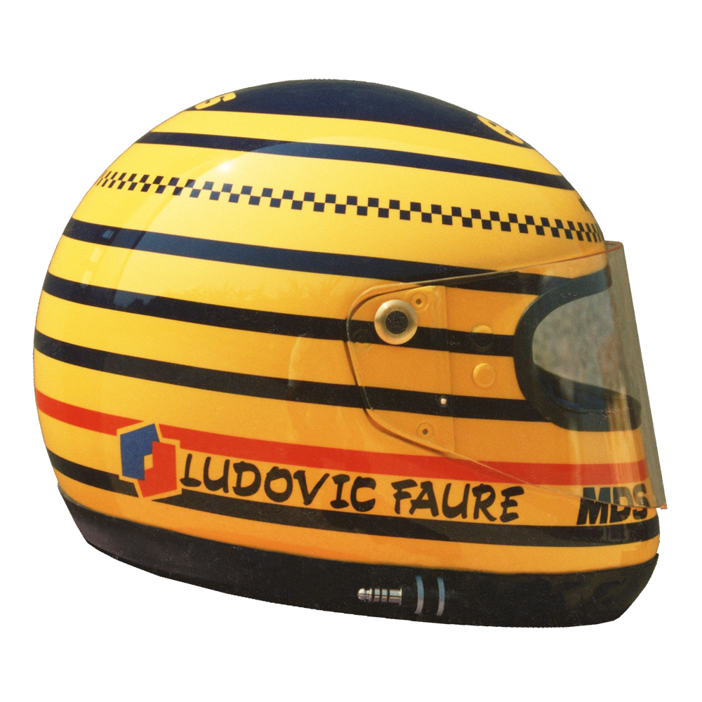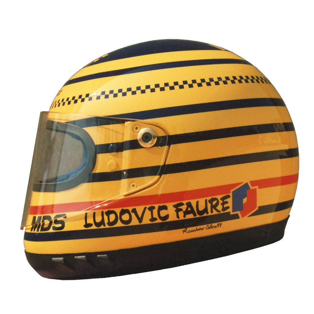 Circuit 1989 Ludovic FAURE #1 Casque MDS F1, peint par Christian Roux / Rainbow Colors en 1989 pour Ludovic Faure, Écurie Elf, 3ème du Championnat de France de Formule 3. Précédent Suivant