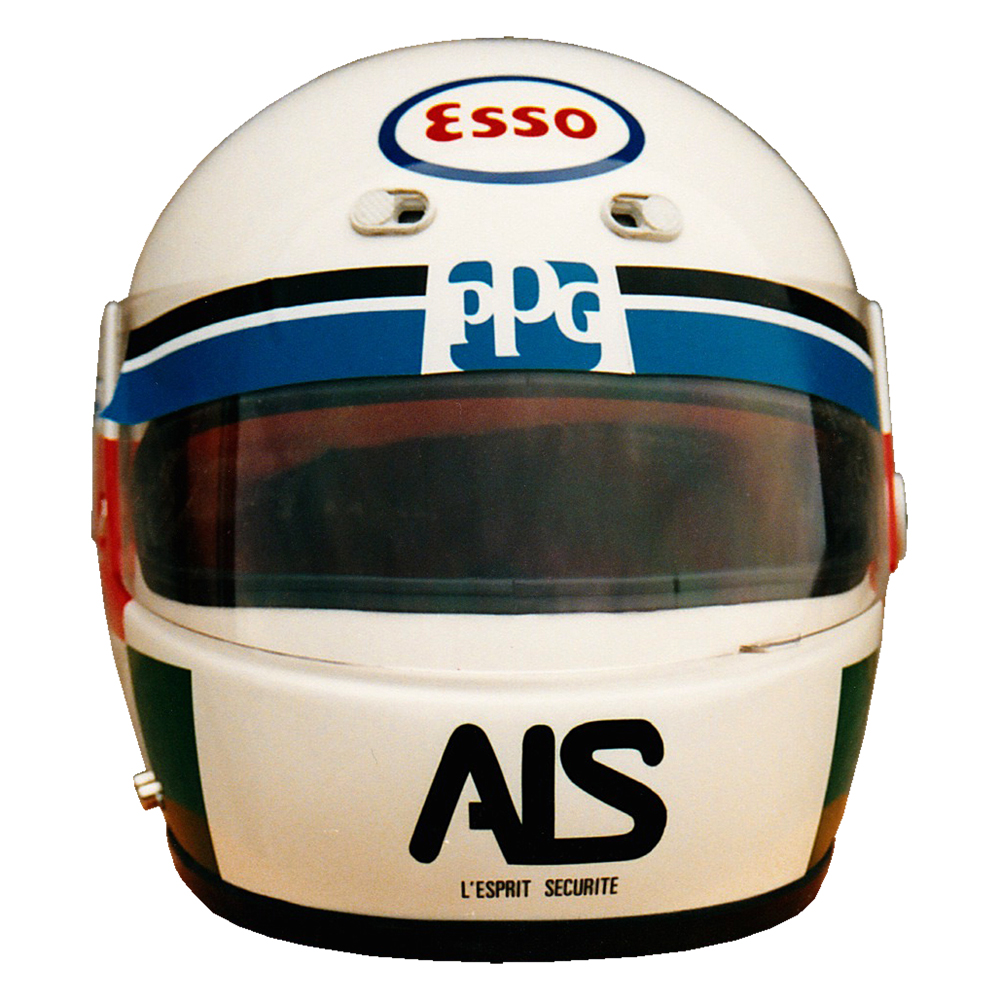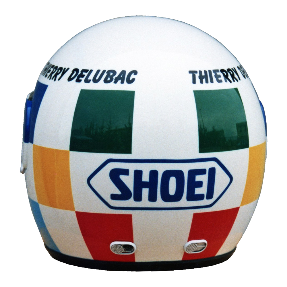 Circuit 1988 Thierry DELUBAC Casque Shoei ZRF-Z, peint par Christian Roux / Rainbow Colors en 1988 pour Thierry Delubac, Écurie Oreca, Championnat de France de Formule 3. Précédent Suivant
