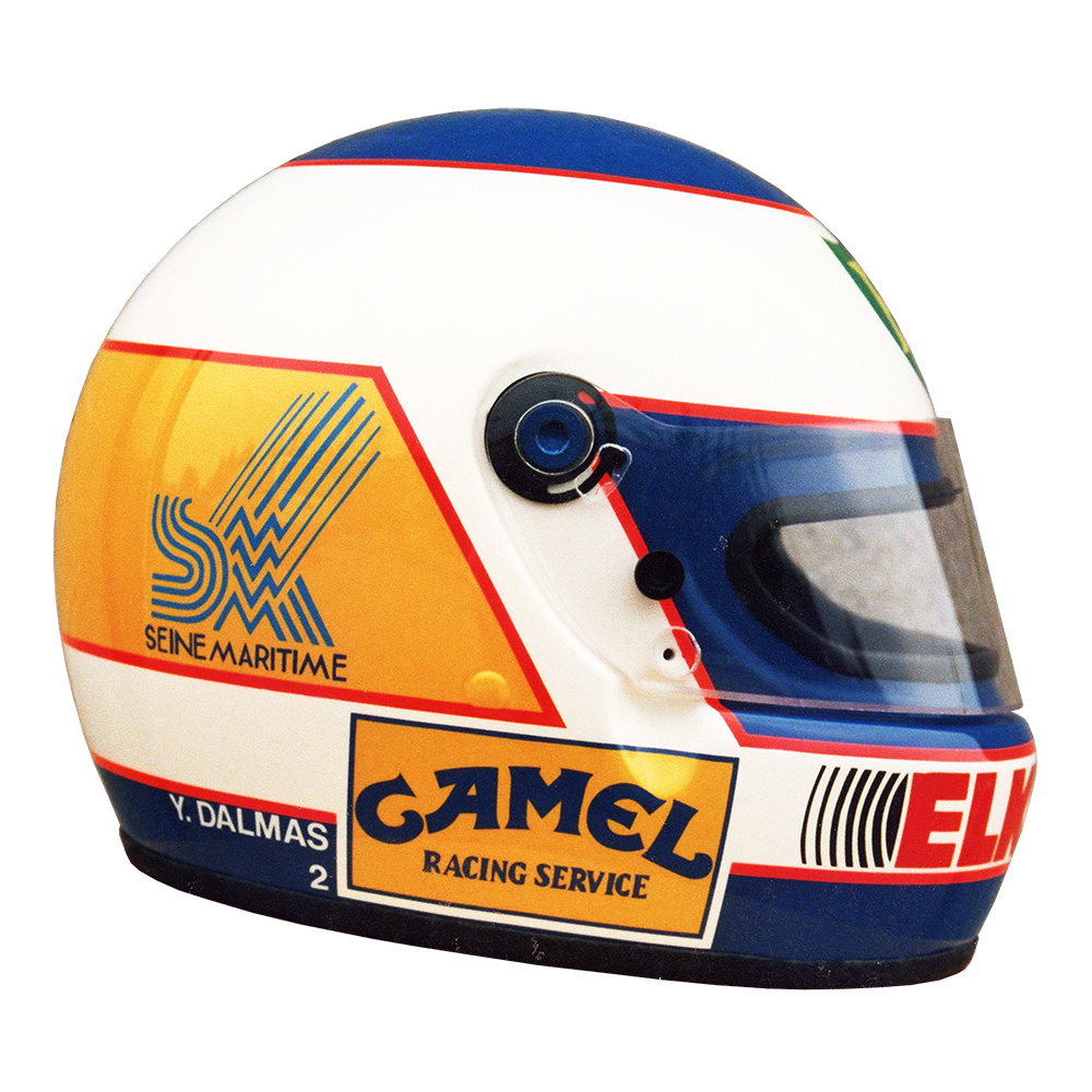 Formule 1 1988 Yannick DALMAS #3 Casque Bell XFM-1, peint par Christian Roux / Rainbow Colors en 1988 pour Yannick Dalmas, Team Larrousse et Calmels F1, Championnat du Monde de Formule 1. Précédent Suivant