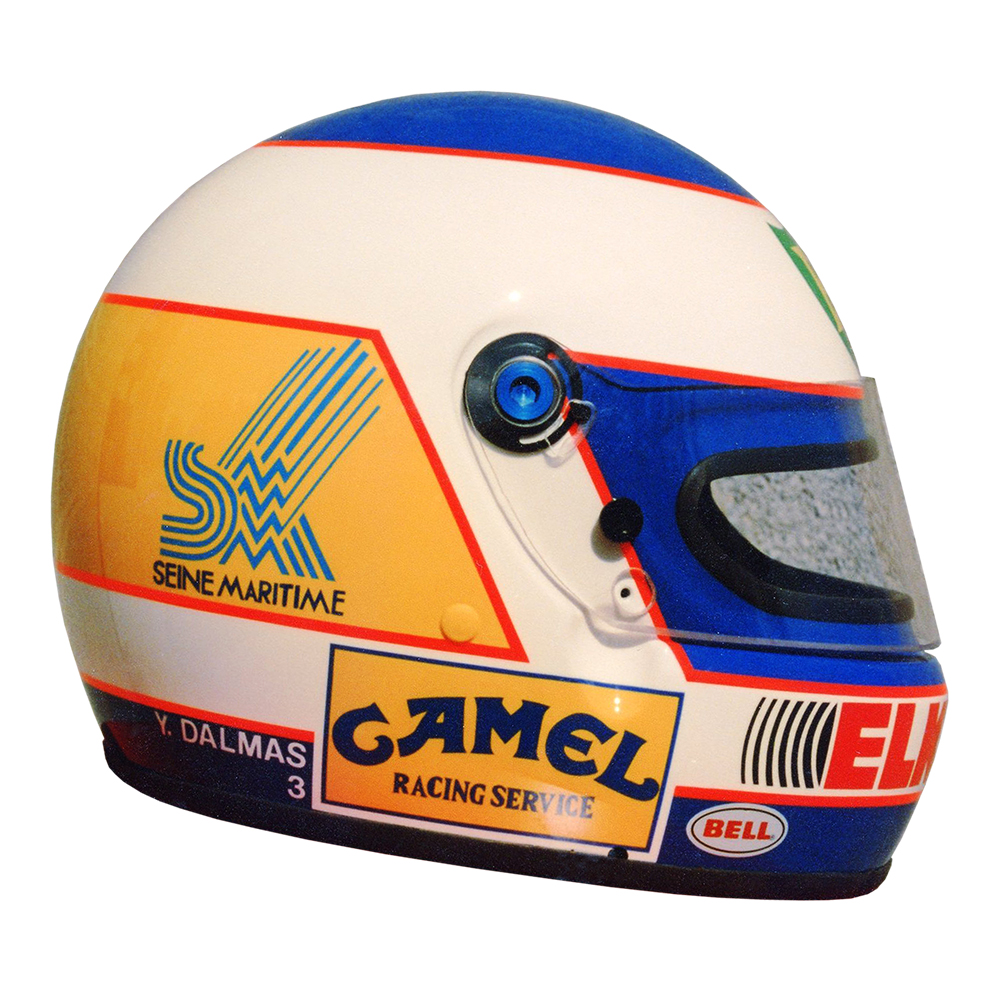 Formule 1 1988 Yannick DALMAS #4 Casque Bell XFM-1, peint par Christian Roux / Rainbow Colors en 1988 pour Yannick Dalmas, Team Larrousse et Calmels F1, Championnat du Monde de Formule 1. Précédent Suivant
