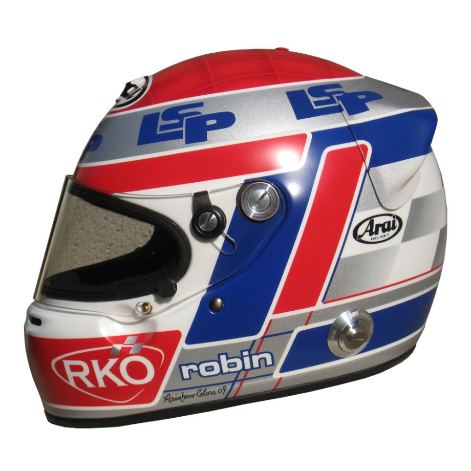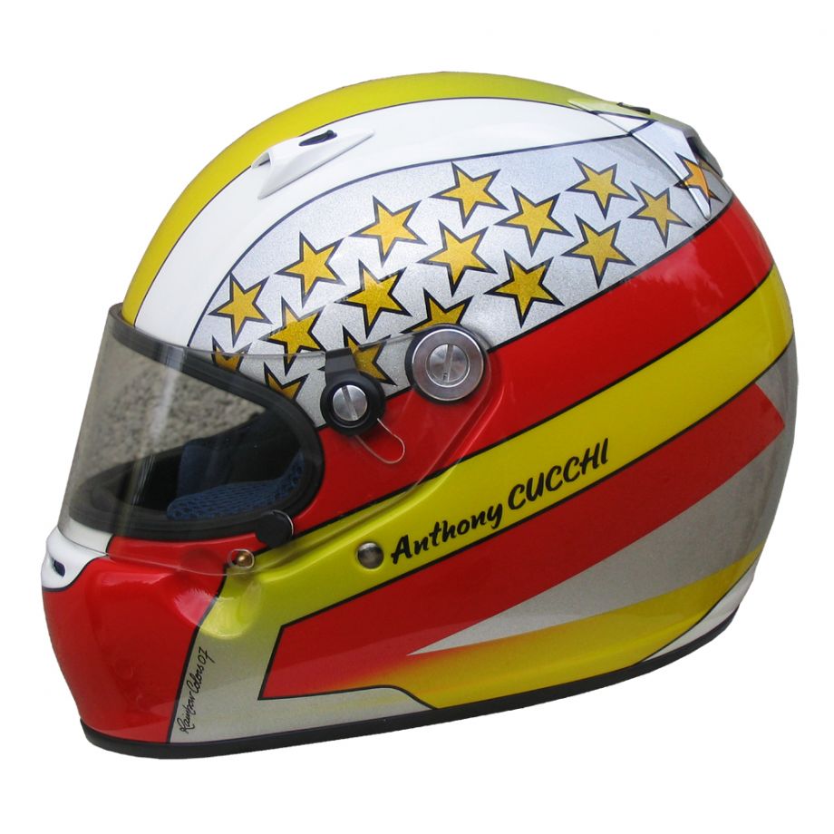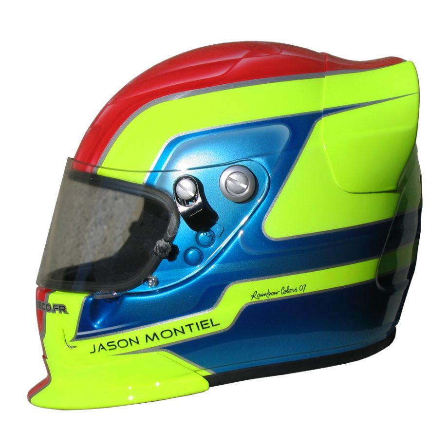 Retrouvez les casques des pilotes de karting dans leurs différentes catégories peints par Christian Roux au travers des nombreuses saisons depuis les débuts de l'activité de Rainbow Colors en 1979.