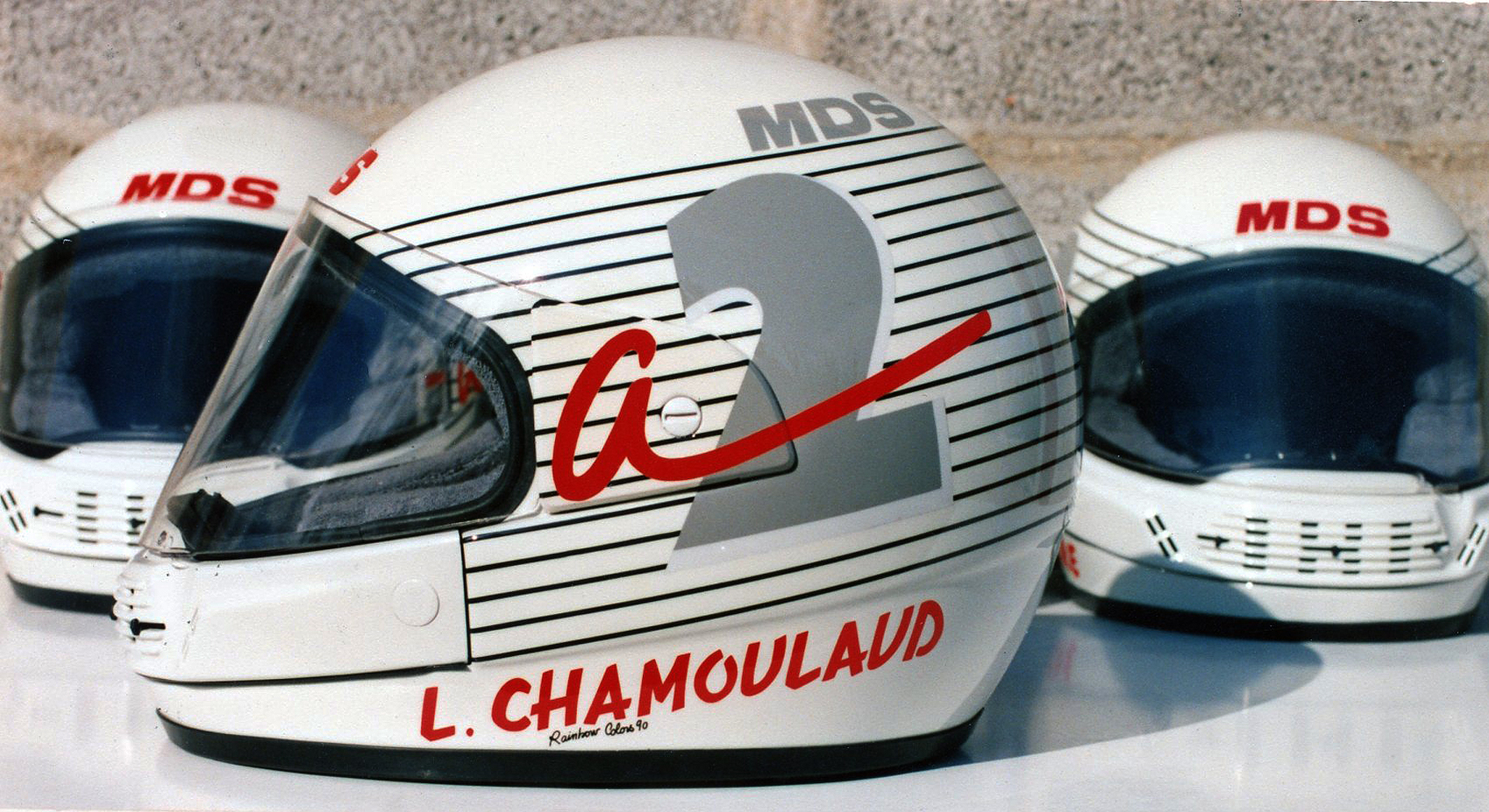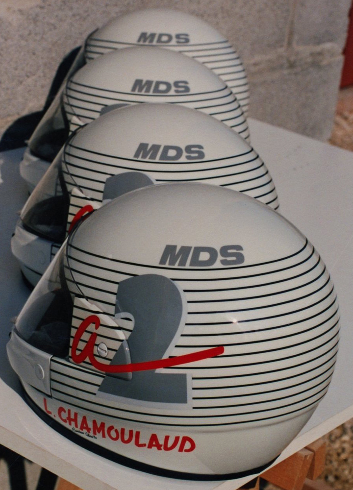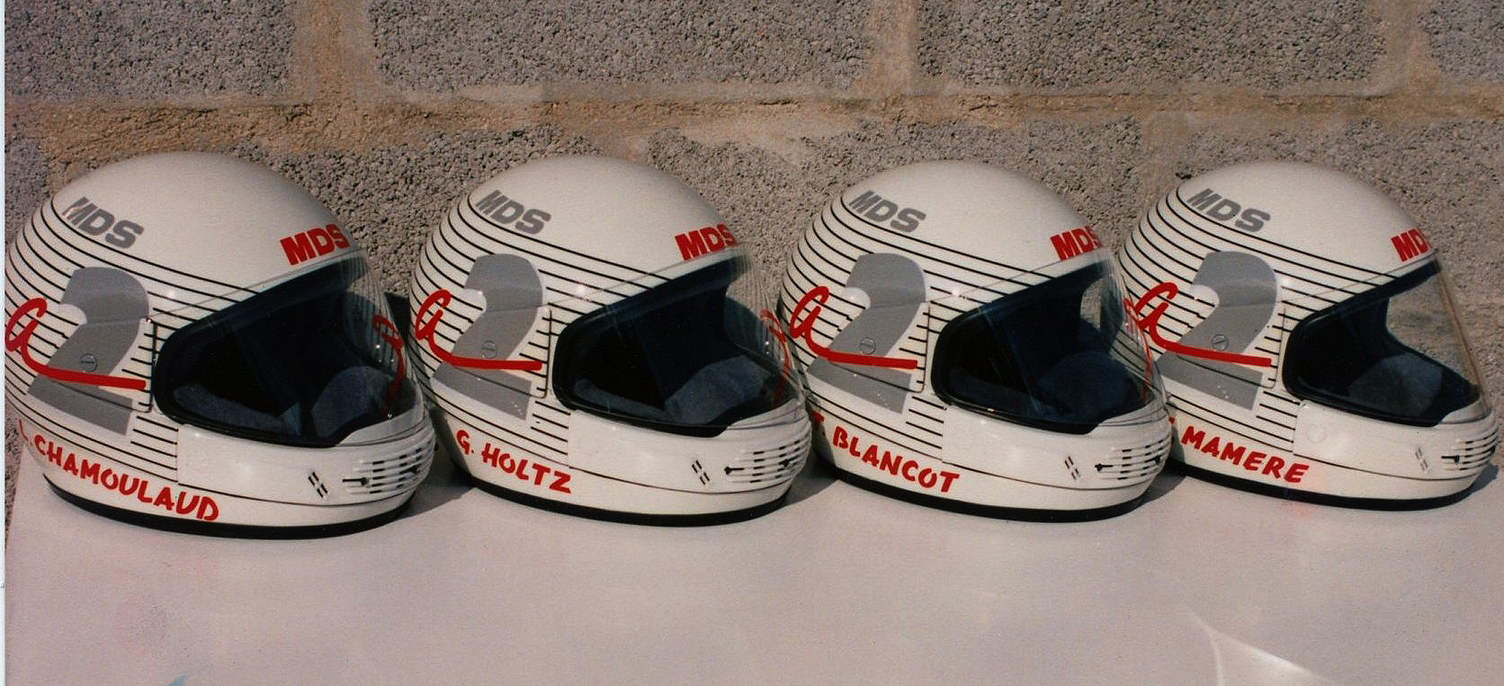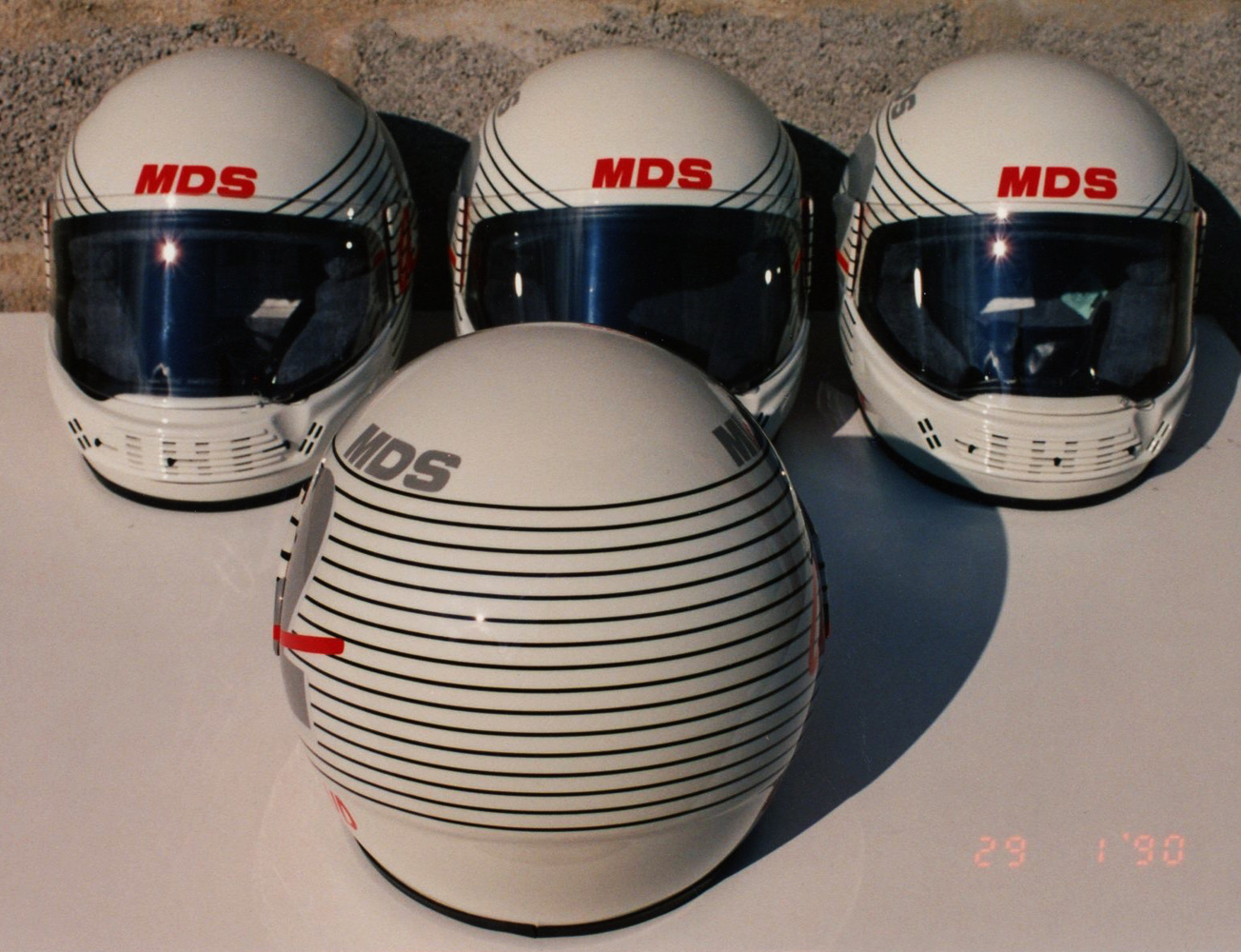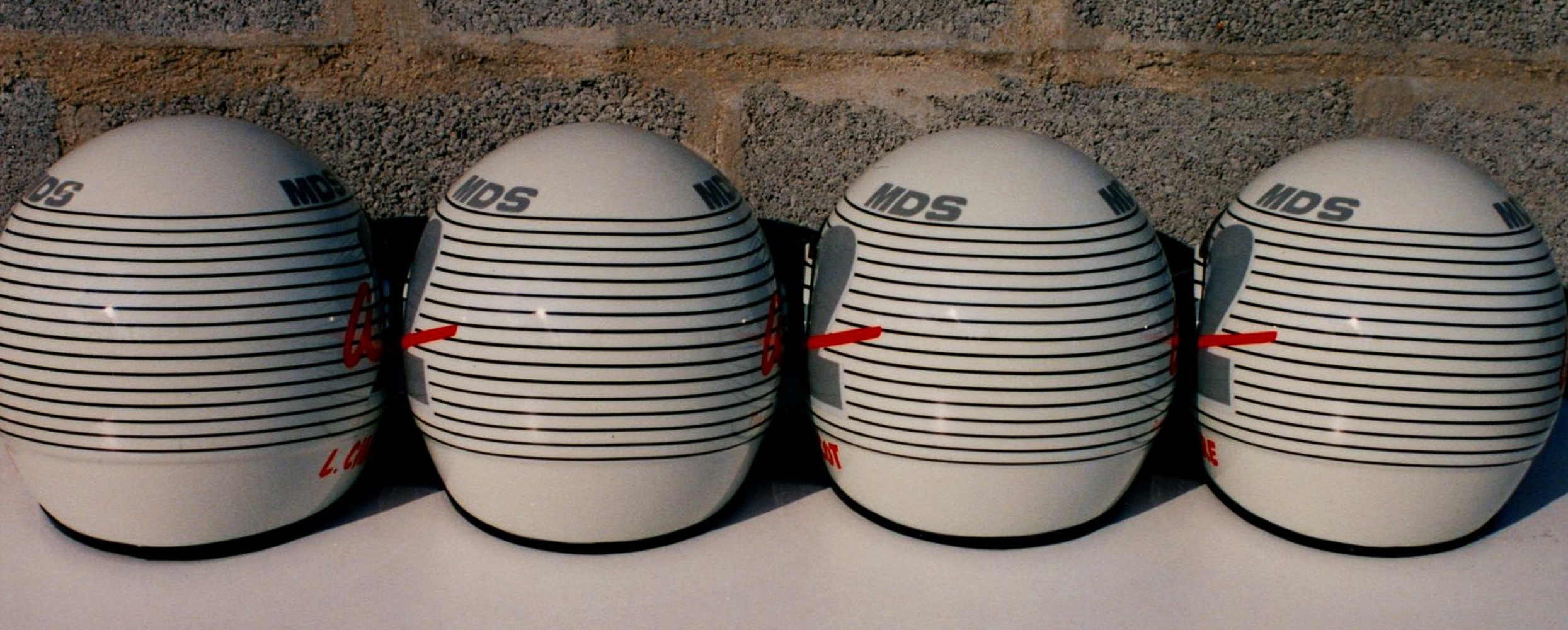 Promotion Publicité 1990 ANTENNE 2 Casques MDS Futura, crées et peints par Christian Roux / Rainbow Colors en 1990 pour les journalistes du Groupe Antenne 2, Gérard Holtz, Lionel Chamoulaud, Noël Mamère, Thierry Blancot. Précédent Suivant
