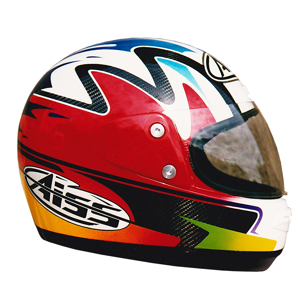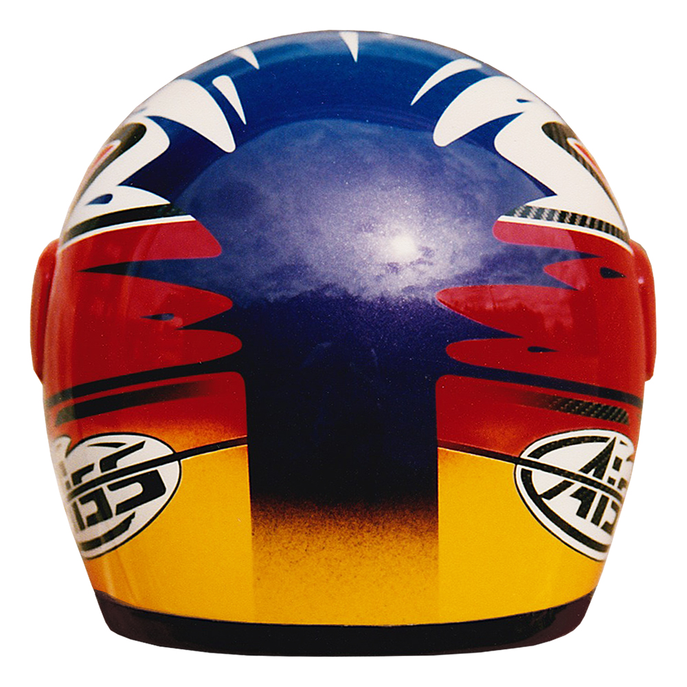 Prototype Série 1994 AISS Carbone Casque AISS Carbone, peint par Christian Roux / Rainbow Colors en 1994 pour la marque Aiss. Précédent Suivant