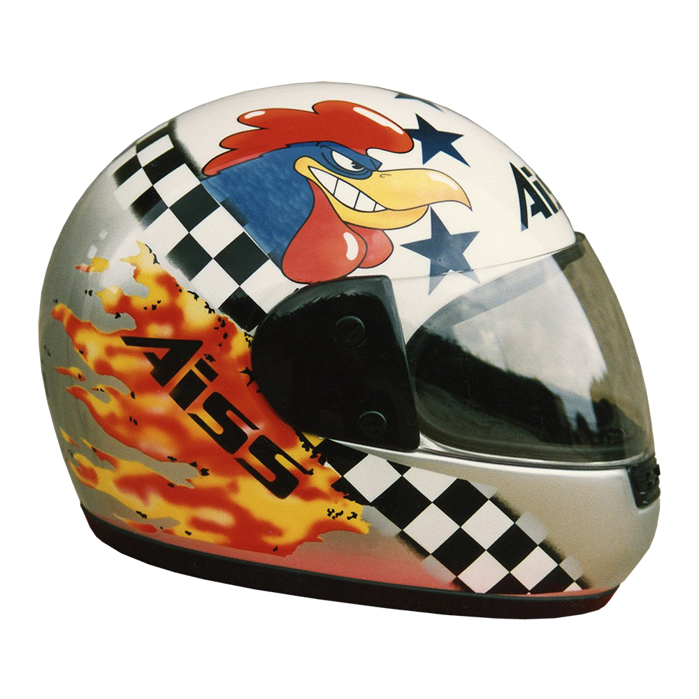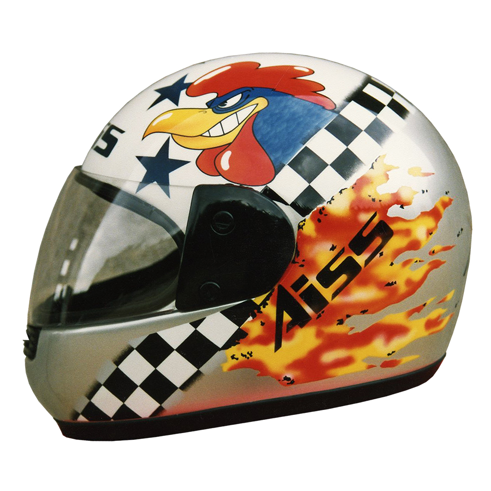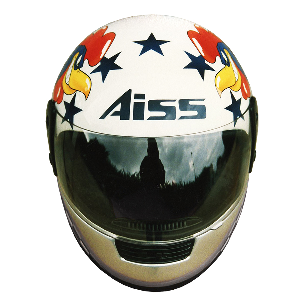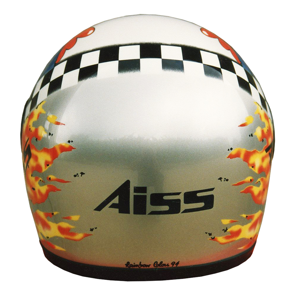 Prototype Série 1994 AISS Eric MAHÉ Blanc Casque Aiss, peint par Christian Roux / Rainbow Colors en 1994 pour la marque Aiss, d'après un dessin de Christian Bar2 Debarre. Précédent Suivant