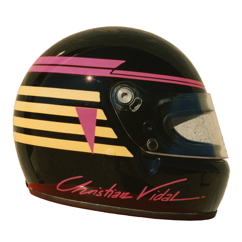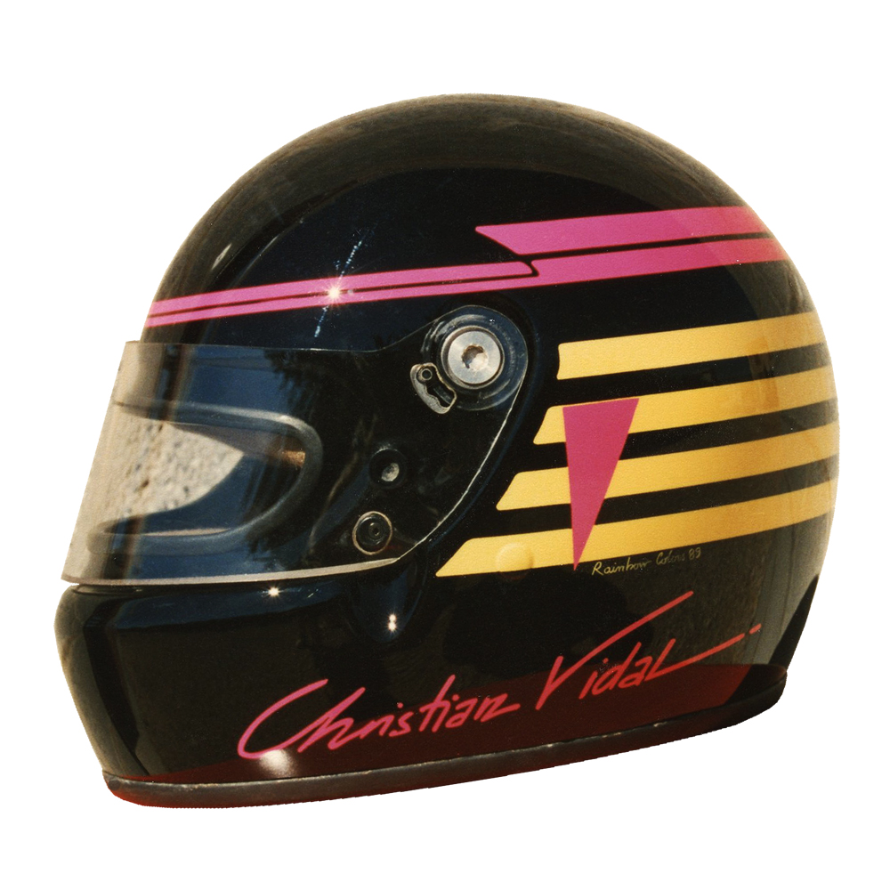 Circuit 1989 Christian VIDAL #1 Casque Bell XFM-1, peint par Christian Roux / Rainbow Colors en 1989 pour Christian Vidal, Équipe Saulnier Racing, Championnat de France de Formule 3. Précédent Suivant