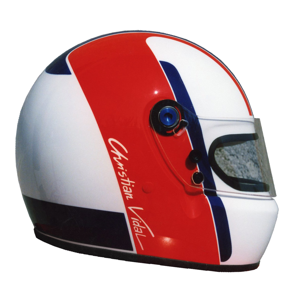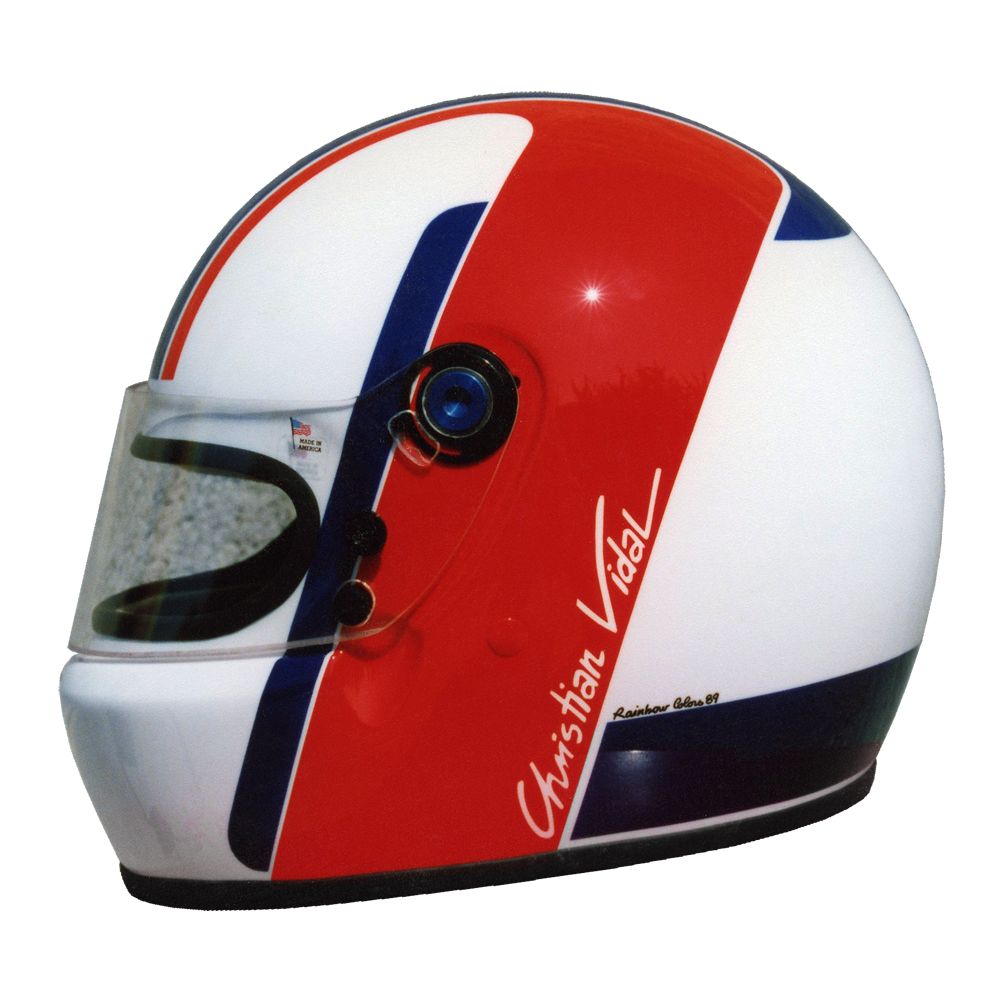 Circuit 1989 Christian VIDAL #2 Casque Bell XFM-1, crée et peint par Christian Roux / Rainbow Colors en 1989 pour Christian Vidal, Équipe Saulnier Racing, Championnat de France de Formule 3. Précédent Suivant