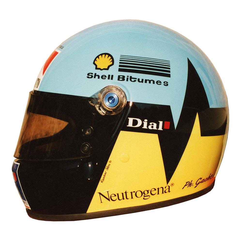 Circuit 1990 Philippe GACHE #2 Casque Bell XFM-1, peint par Christian Roux / Rainbow Colors en 1990 pour Philippe Gache, Team Apomatox et Galaxy Racing, Championnat International de Formule 3000. Précédent Suivant