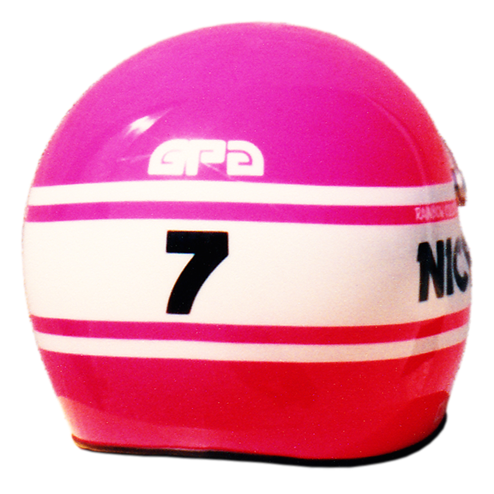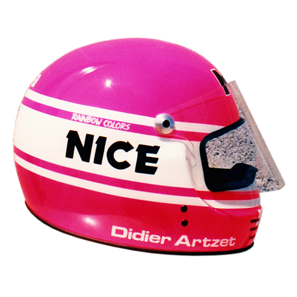 Circuit 1987 Didier ARTZET #3 Casque GPA G1, peint par Christian Roux / Rainbow Colors en 1987 pour Didier Artzet, Écurie KTR, Vainqueur Grand Prix de Monaco F3. Précédent Suivant