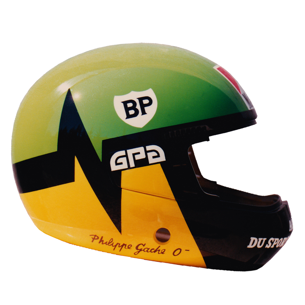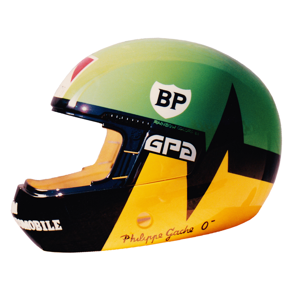 Circuit 1988 Philippe GACHE #1 Casque GPA C2G, peint par Christian Roux / Rainbow Colors en 1988 pour Philippe Gache, écurie Oreca, Championnat de France de Formule 3. Précédent Suivant