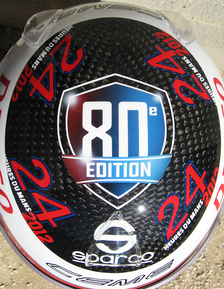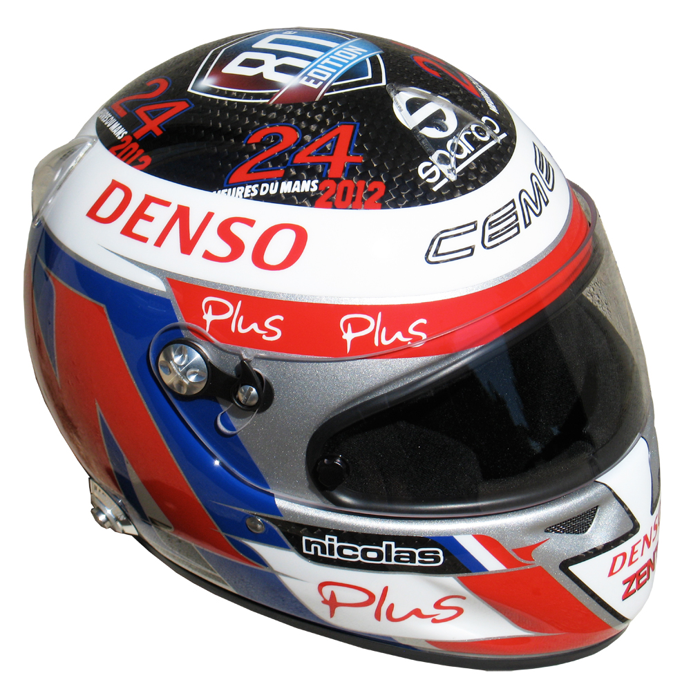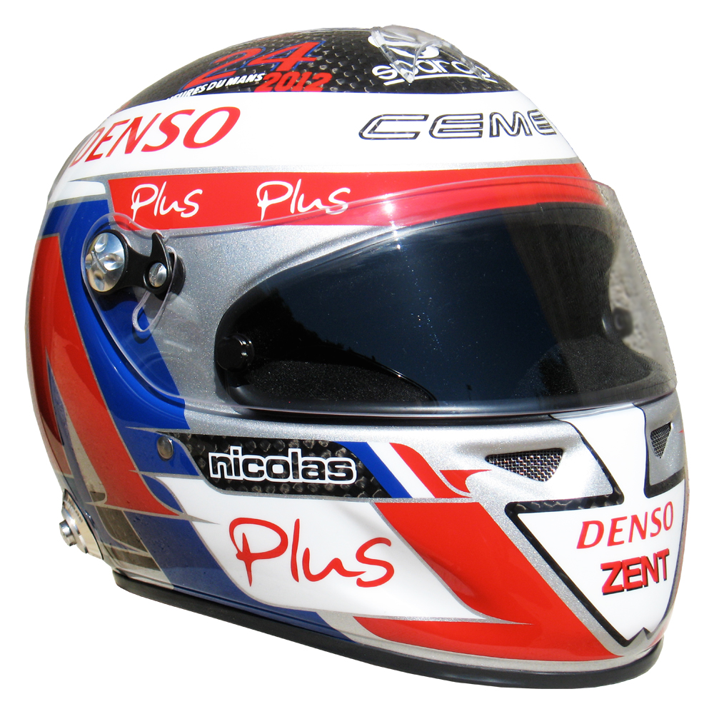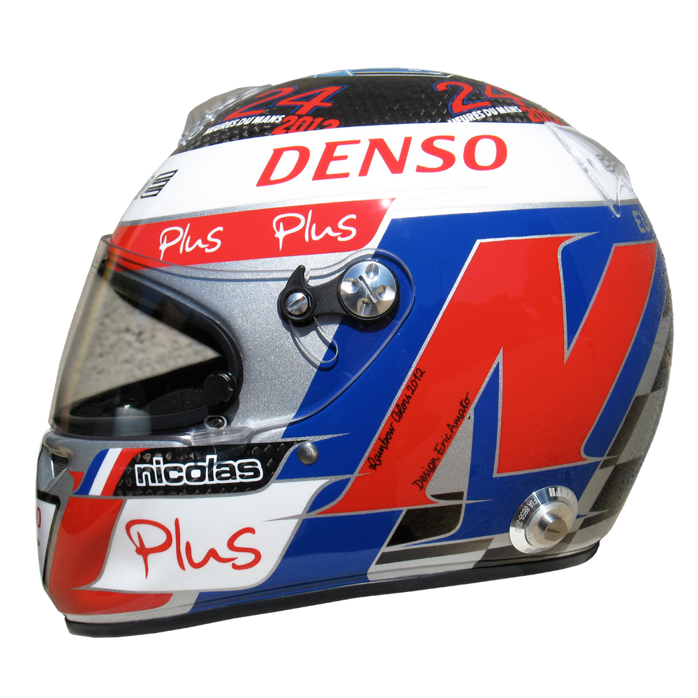 Circuit 2012 Nicolas LAPIERRE #3 24 Heures du Mans Casque Sparco F1-ADV, peint par Christian Roux / Rainbow Colors en 2012 pour Nicolas Lapierre, 24 Heures du Mans, Team Toyota Racing. Précédent Suivant