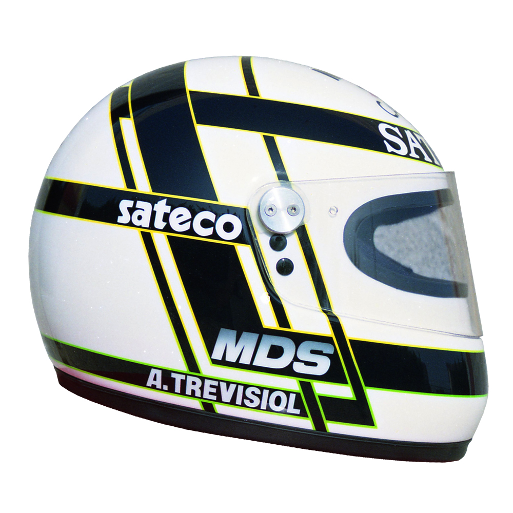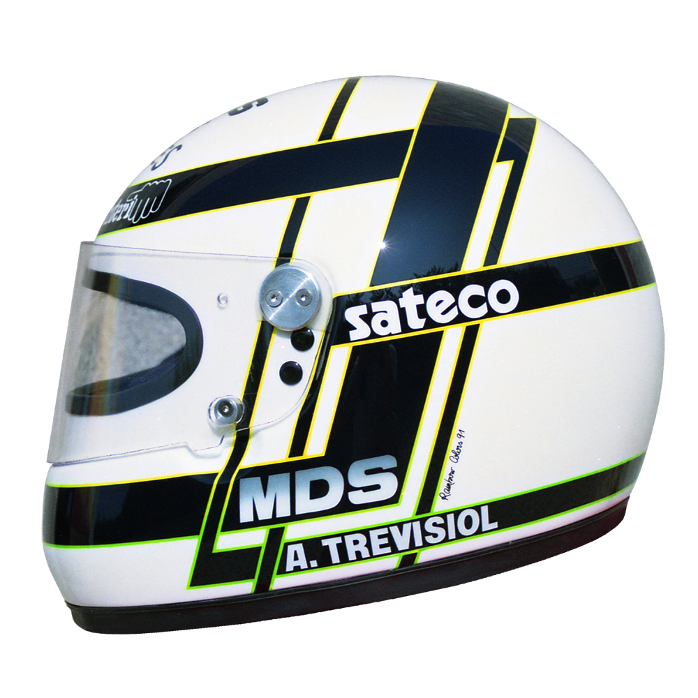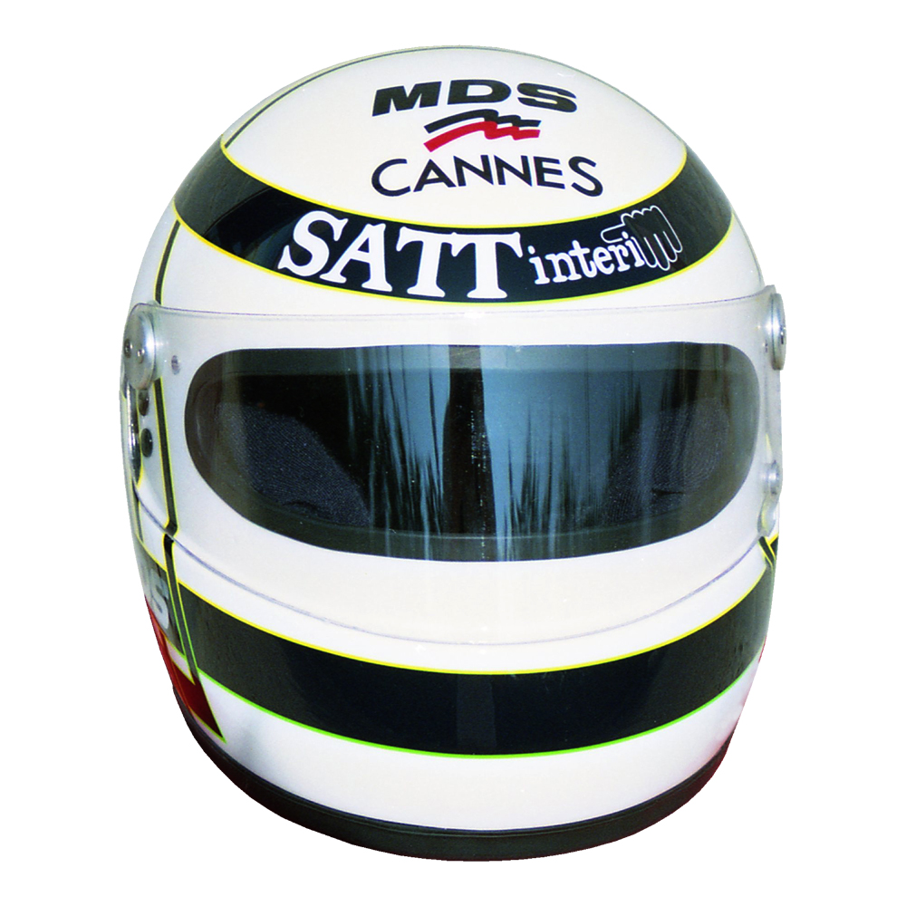 Circuit 1991 Arnaud TREVISIOL #2 Casque MDS F1, peint par Christian Roux / Rainbow Colors en 1991 pour Arnaud Trevisiol, Écurie Promatecme, Championnat de France de Formule 3. Précédent Suivant