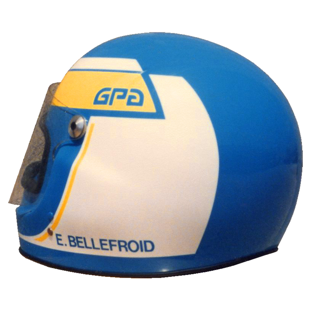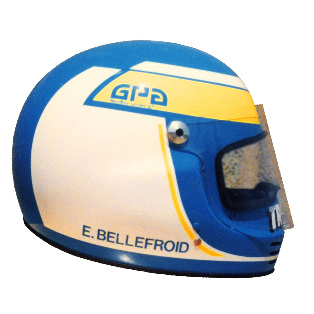 Circuit 1987 Eric BELLEFROID Casque GPA G1, peint par Christian Roux / Rainbow Colors en 1987 pour Eric Bellefroid, Écurie Promatecme Serge Saulnier, Championnat de France de Formule 3. Précédent Suivant