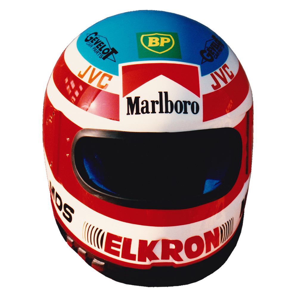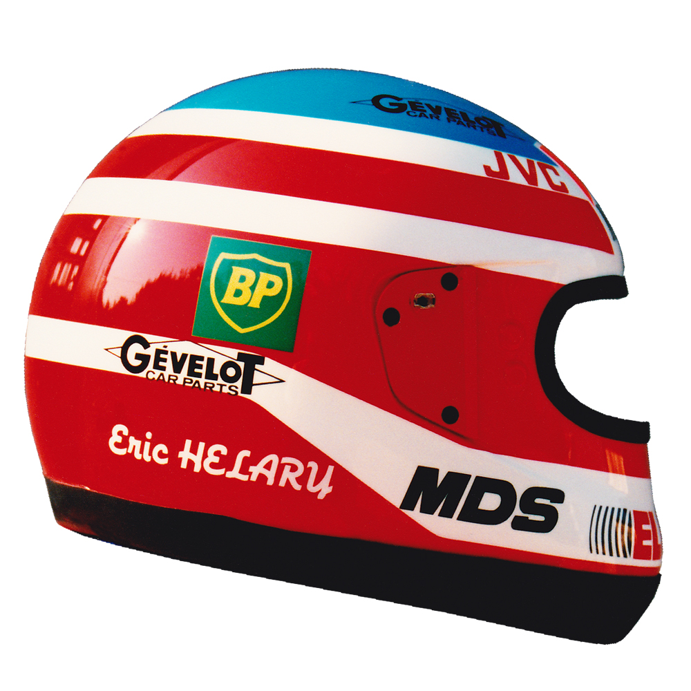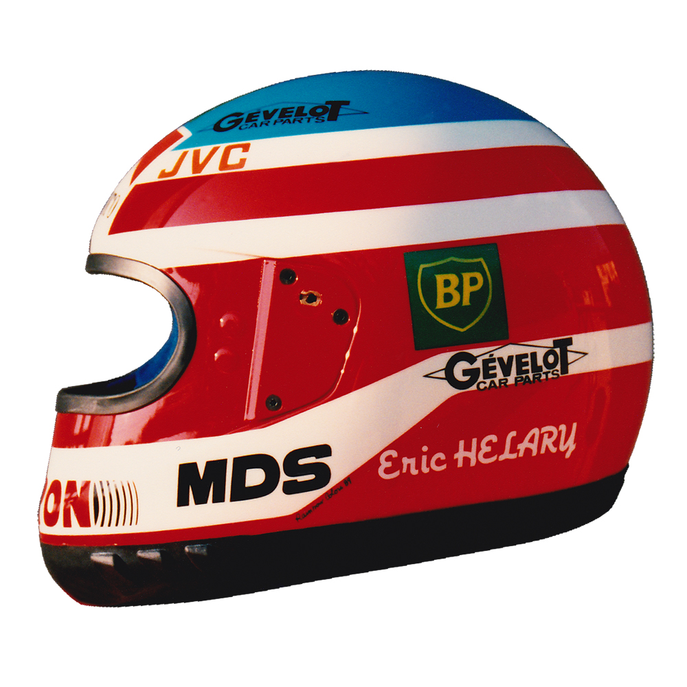 Circuit 1989 Éric HÉLARY #2 Casque MDS F1, peint par Christian Roux / Rainbow Colors en 1989 pour Éric Hélary, Team Oreca, 4 ème Championnat de France de Formule 3. Précédent Suivant