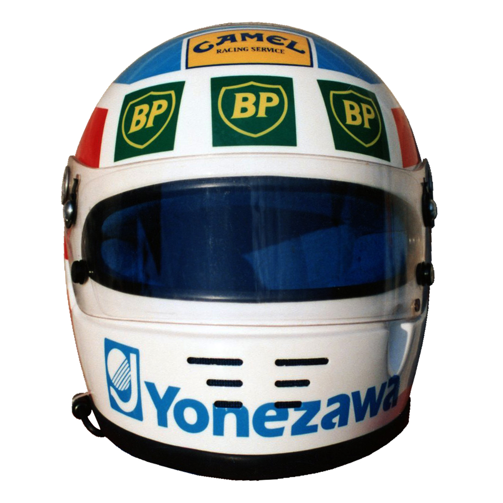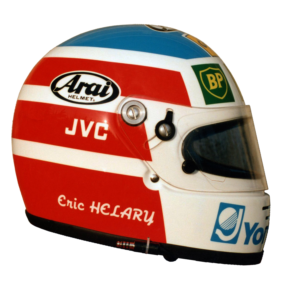 Circuit 1990 Éric HÉLARY Casque Arai GP 2, peint par Christian Roux / Rainbow Colors en 1990 pour Éric Hélary, Team Formula Project, Champion de France de Formule 3. Précédent Suivant