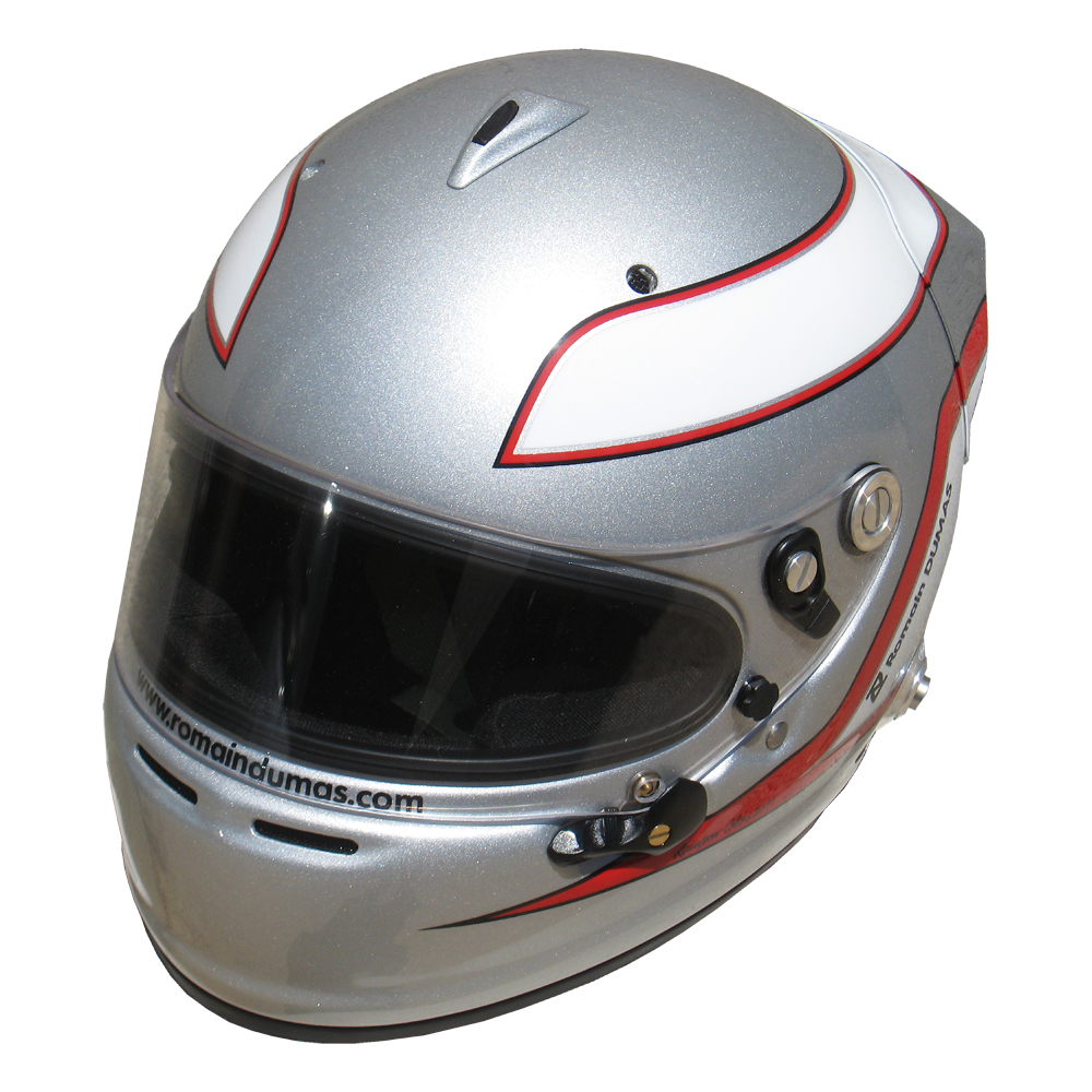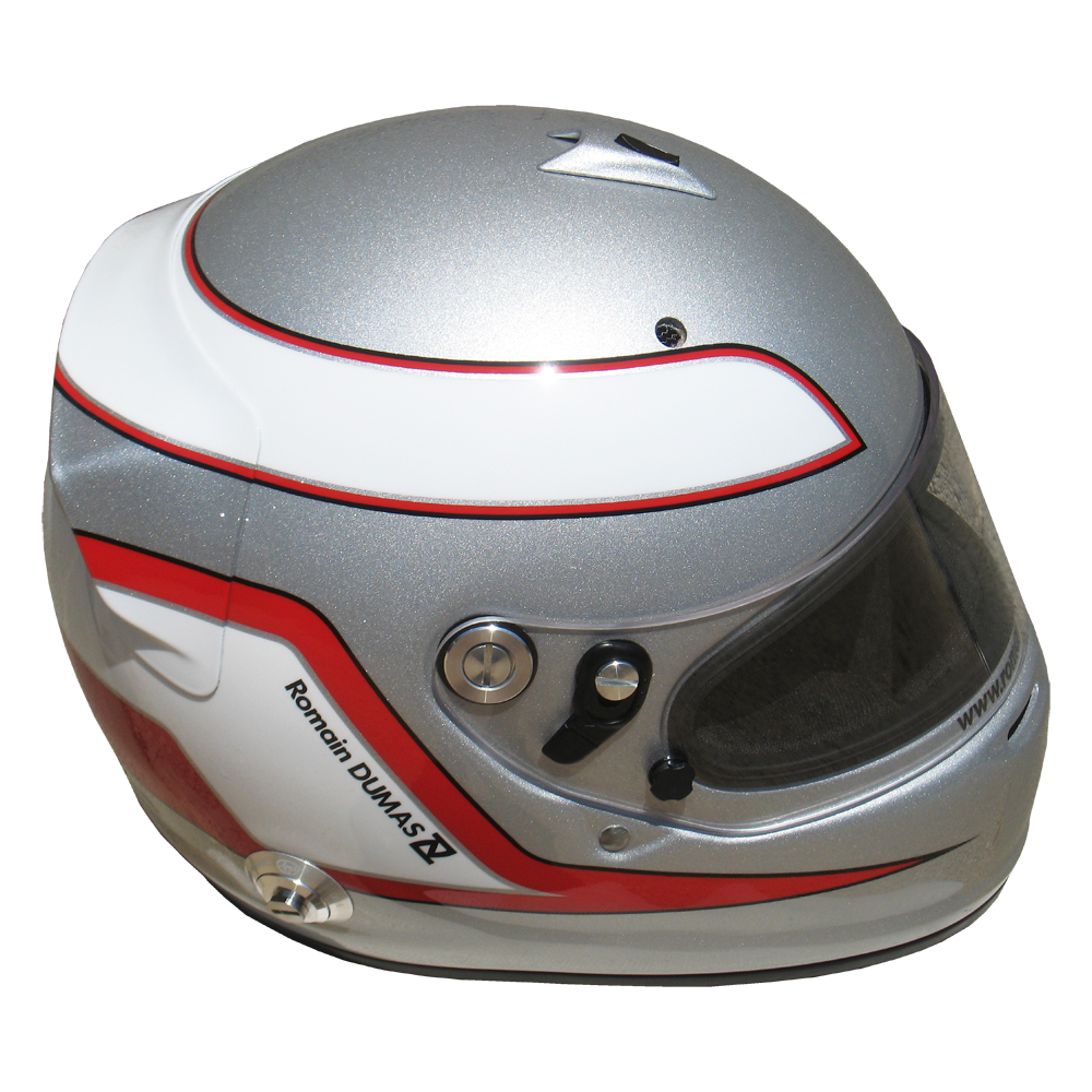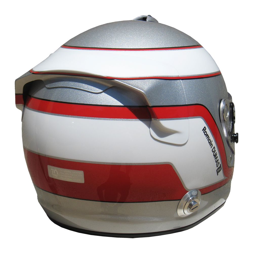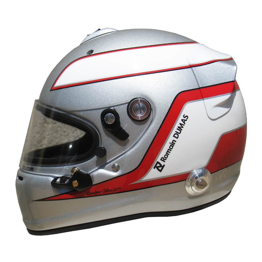 Casques Arai GP 6 RC, peint par Christian Roux / Rainbow Colors en 2011 pour Romain Dumas, Team Audi Sport Joest, Muscle Milk Aston Martin Racing, Mantey Racing et Porsche Motorsports America, Le Mans Series, 24 Heures du Nürburgring, American Le Mans Series.