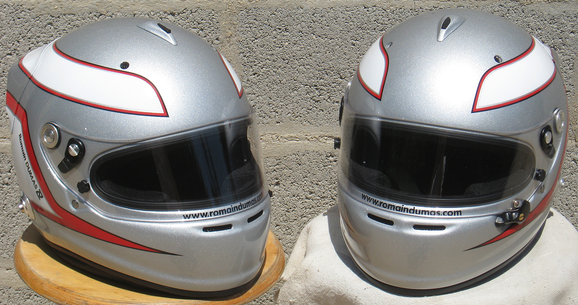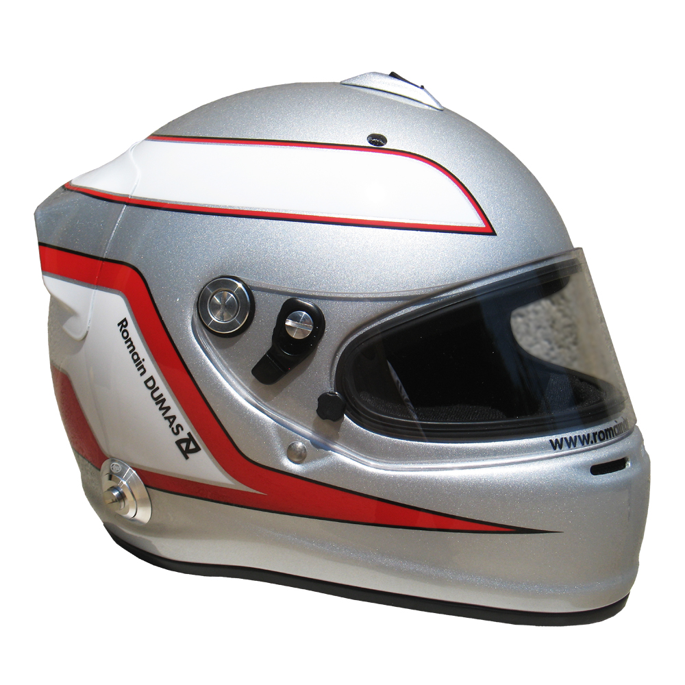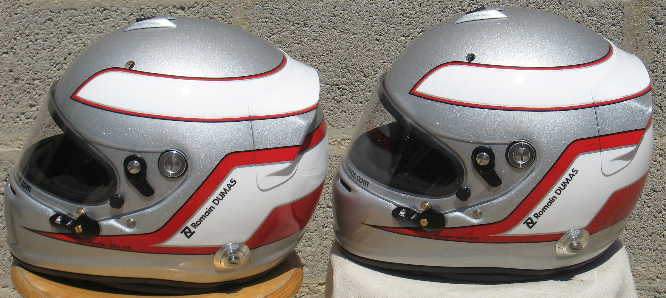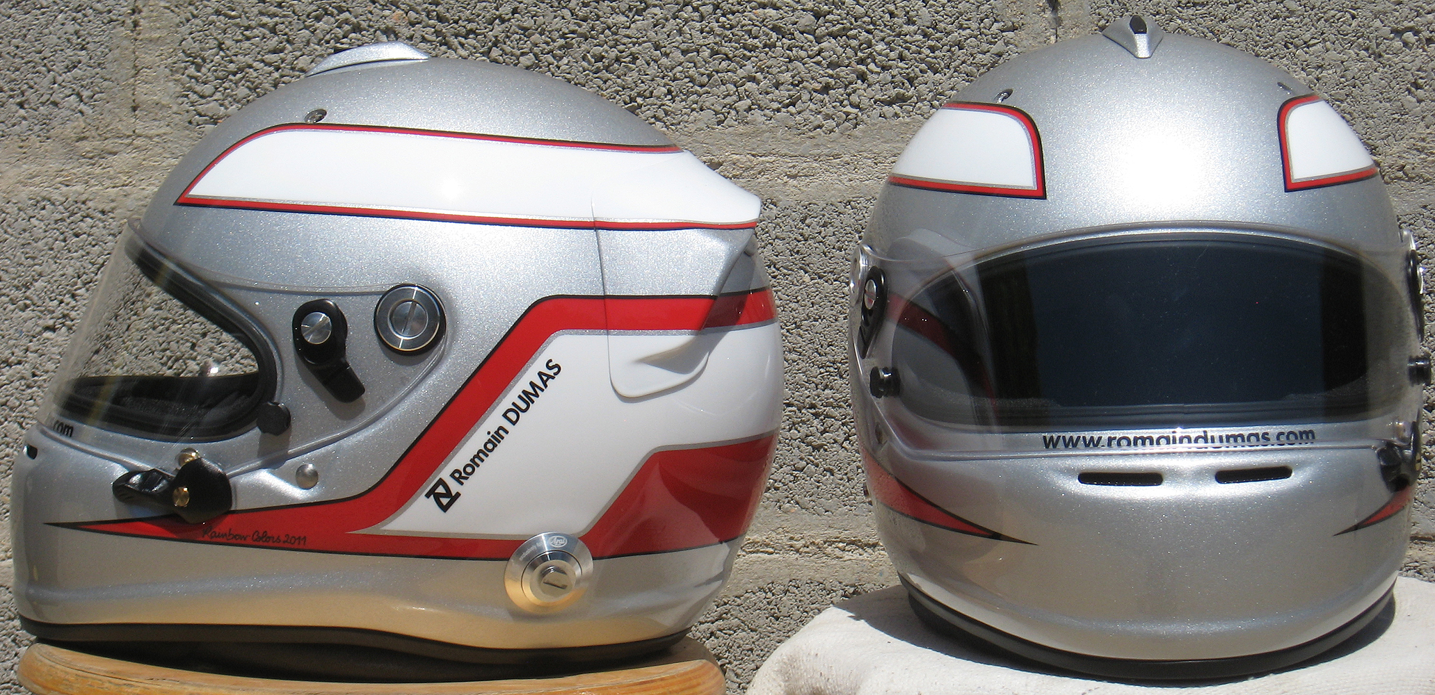 Casques Arai GP 6 RC, peint par Christian Roux / Rainbow Colors en 2011 pour Romain Dumas, Team Audi Sport Joest, Muscle Milk Aston Martin Racing, Mantey Racing et Porsche Motorsports America, Le Mans Series, 24 Heures du Nürburgring, American Le Mans Series.