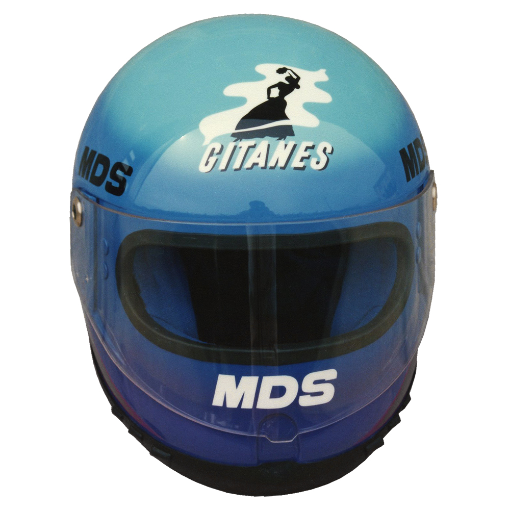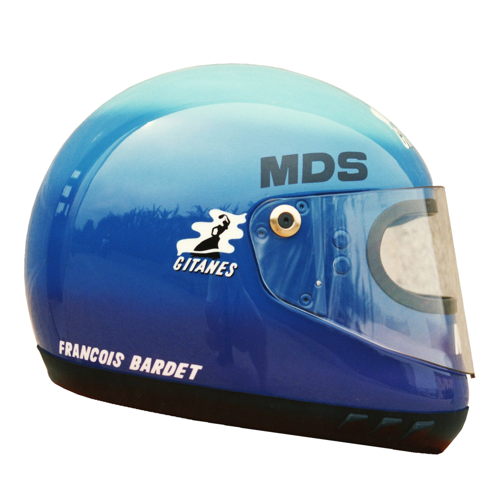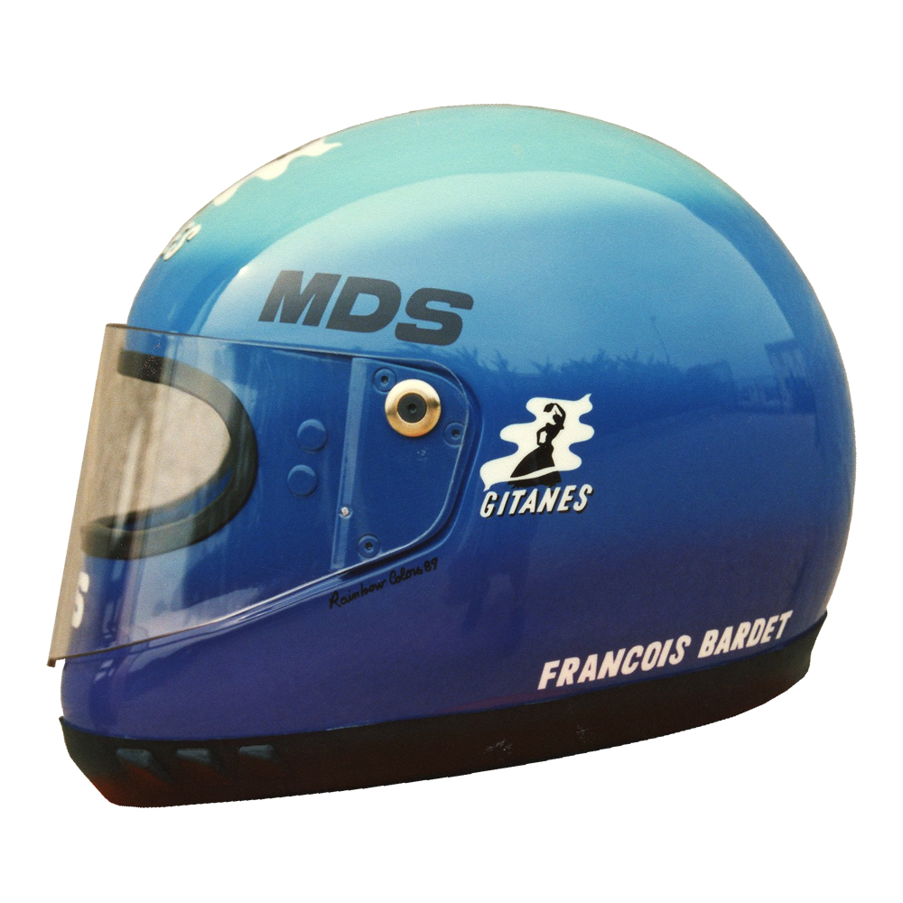 Circuit 1989 François BARDET Casque MDS F1, peint par Christian Roux / Rainbow Colors en 1989 pour François Bardet, Équipe Gitanes, Championnat de France de Formule Renault. Précédent Suivant