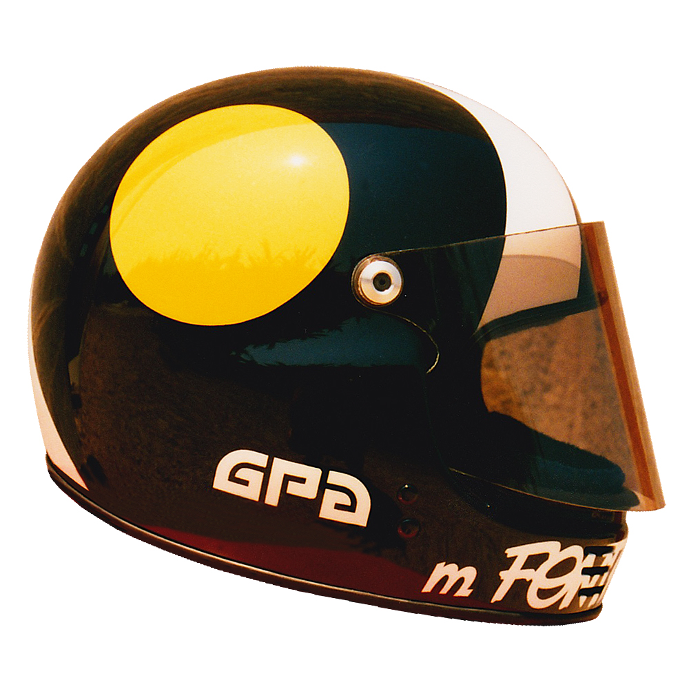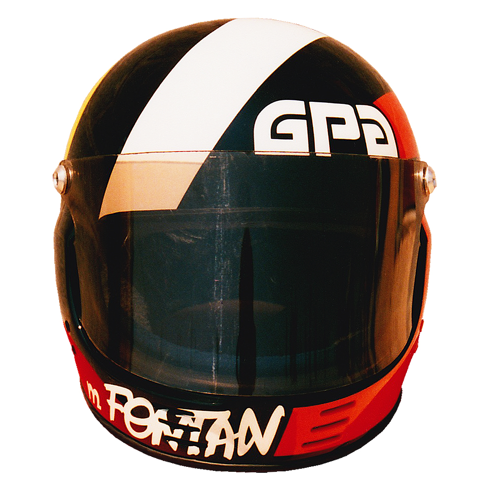 Circuit 1989 Marc FONTAN #1 Casque GPA G1, peint par Christian Roux / Rainbow Colors en 1989 pour Marc Fontan, Automobiles Louis Descartes, Championnat du Monde des Sports Prototype. Précédent Suivant