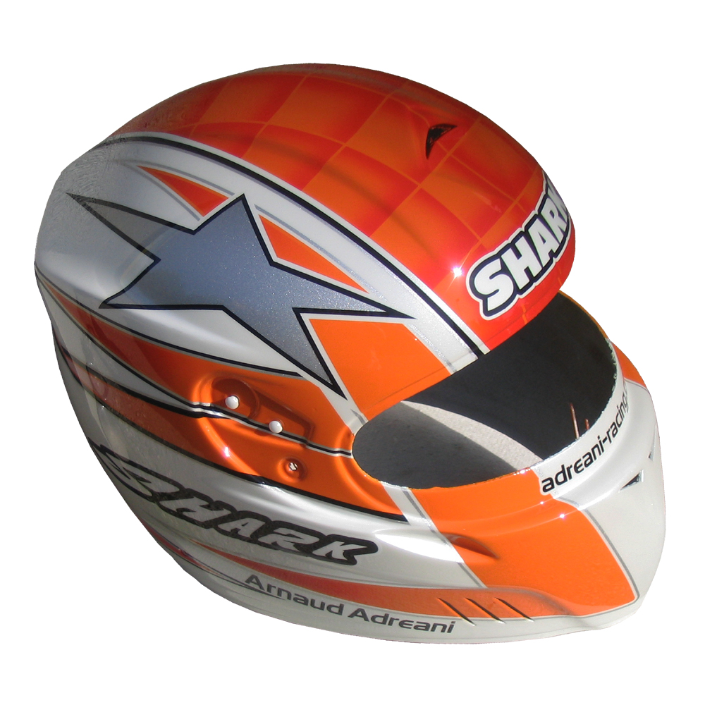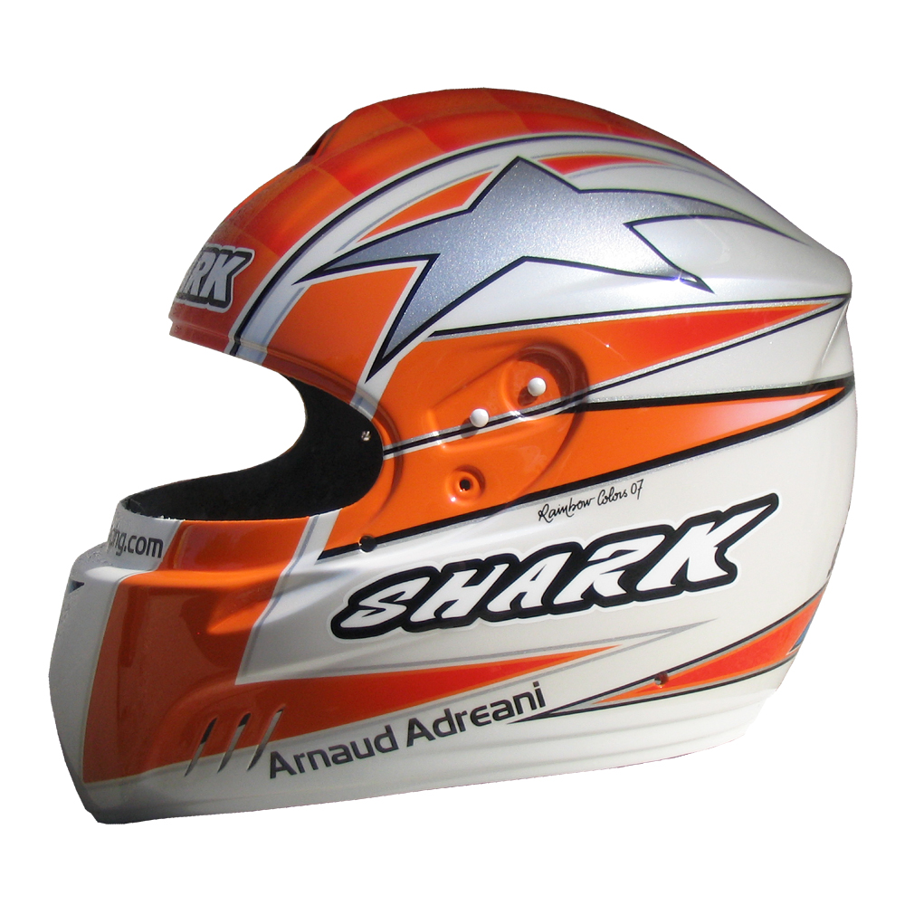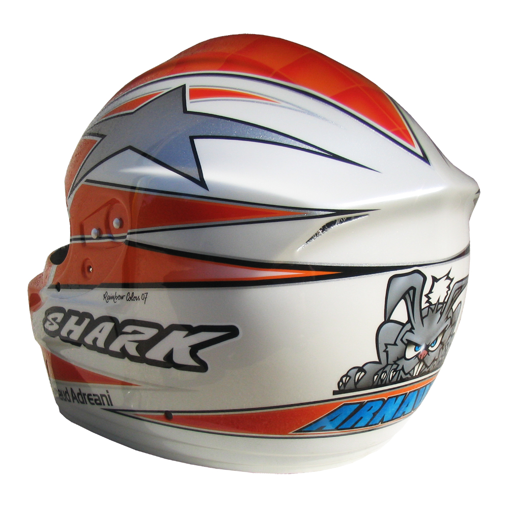 Circuit 2007 Arnaud ADREANI Casque Shark RS 4 F1, peint par Christian Roux / Rainbow Colors en 2007 pour Arnaud Adreani, Team Exigence Motorsport, Coupe Renault Clio France. Précédent Suivant