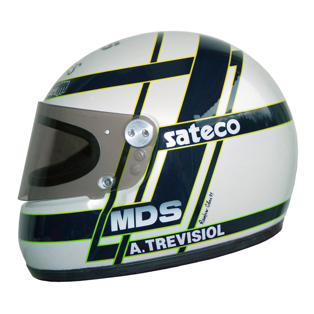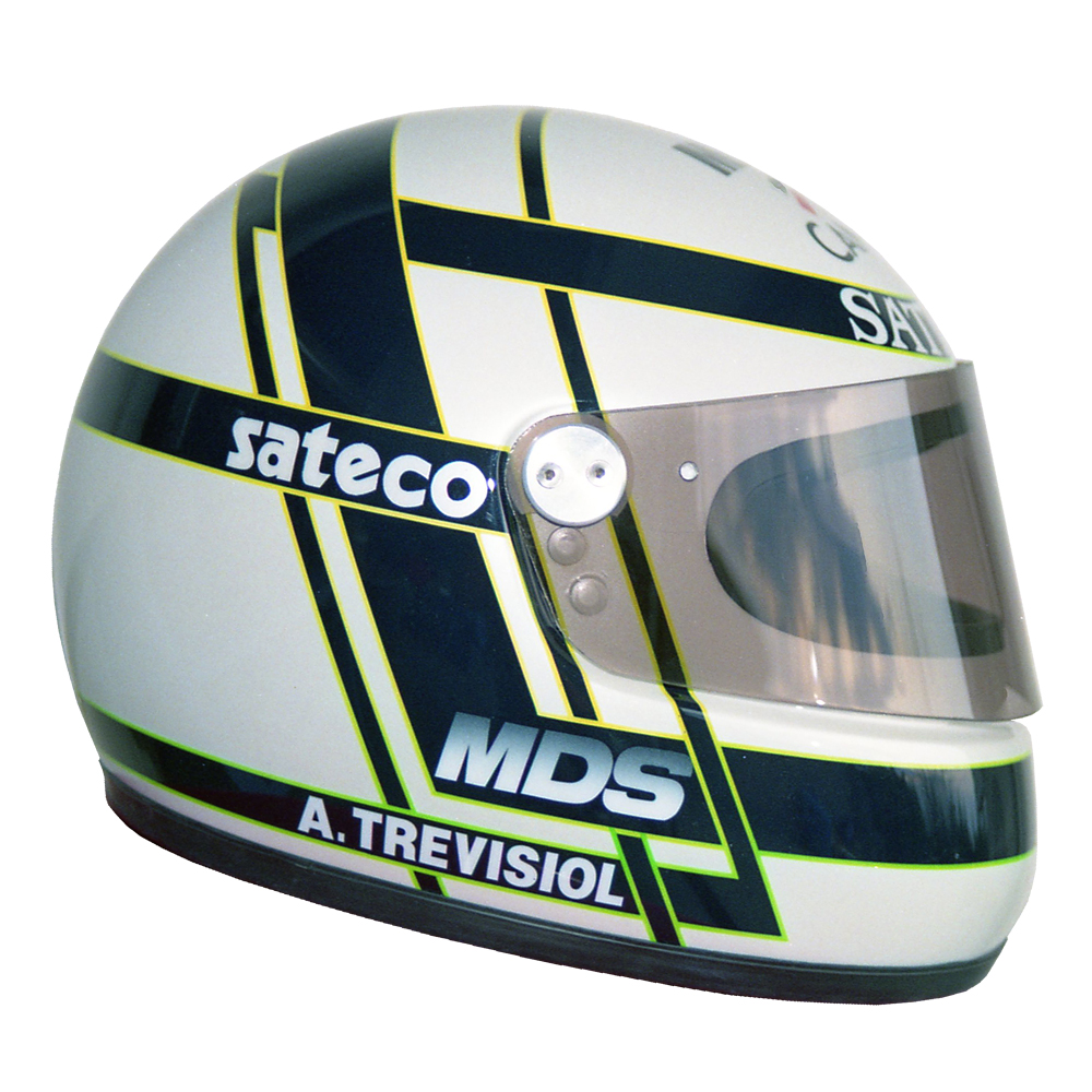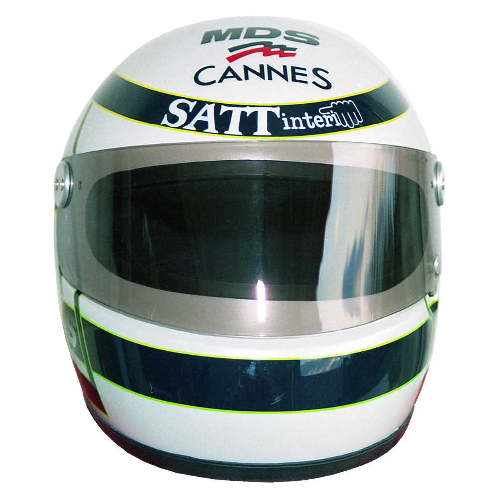 Circuit 1991 Arnaud TREVISIOL #1 Casque MDS F1, peint par Christian Roux / Rainbow Colors en 1991 pour Arnaud Trevisiol, Écurie Promatecme, Championnat de France de Formule 3. Précédent Suivant