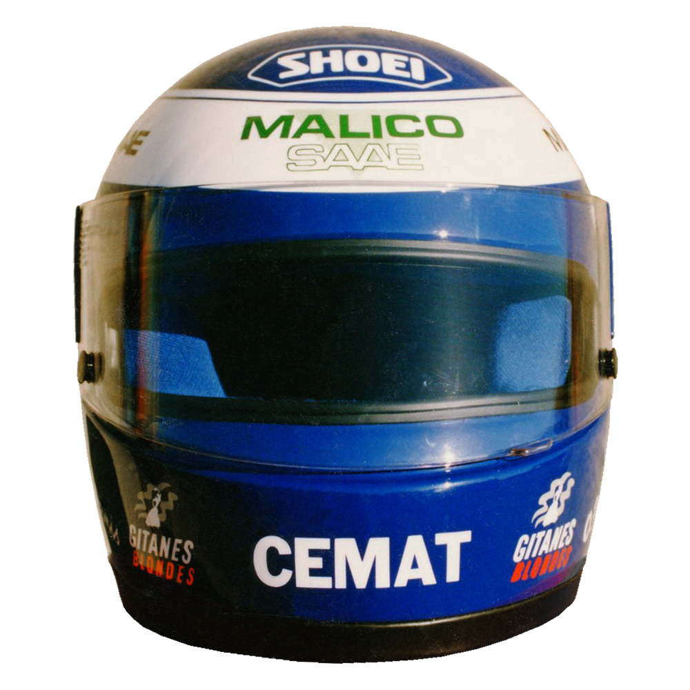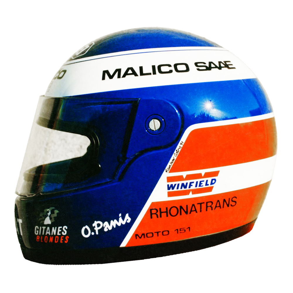 Formule 1 1991 Olivier PANIS #2 Casque Shoei GRV 4, peint par Christian Roux / Rainbow Colors en 1991 pour Olivier Panis, Team la Filière Elf, Vice Champion de France Formule 3. Précédent Suivant